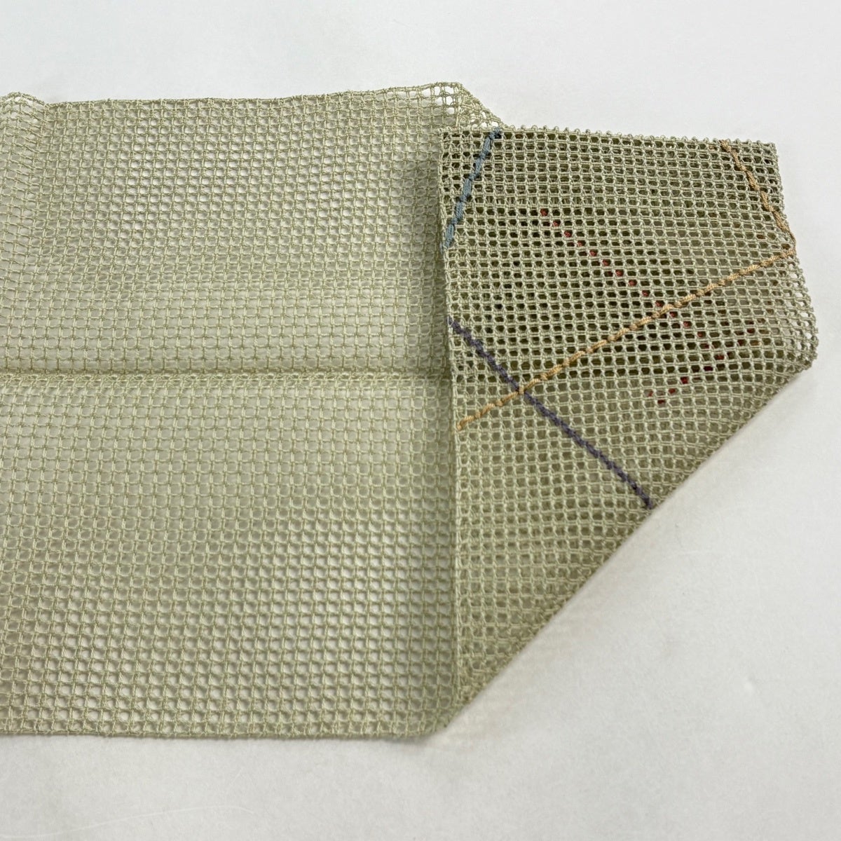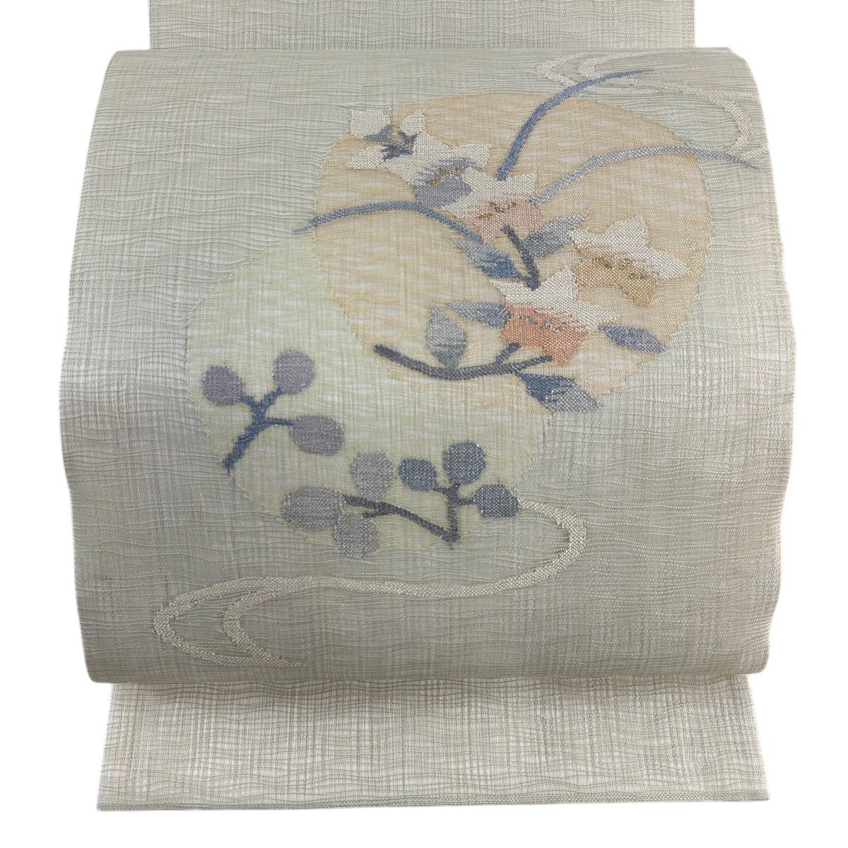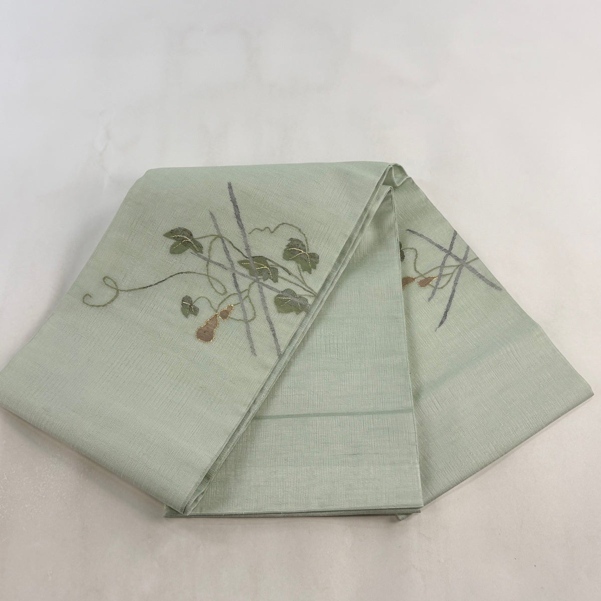 50%OFF 袋帯 名品 夏帯 草花 銀糸 薄緑 お太鼓柄 正絹 K50