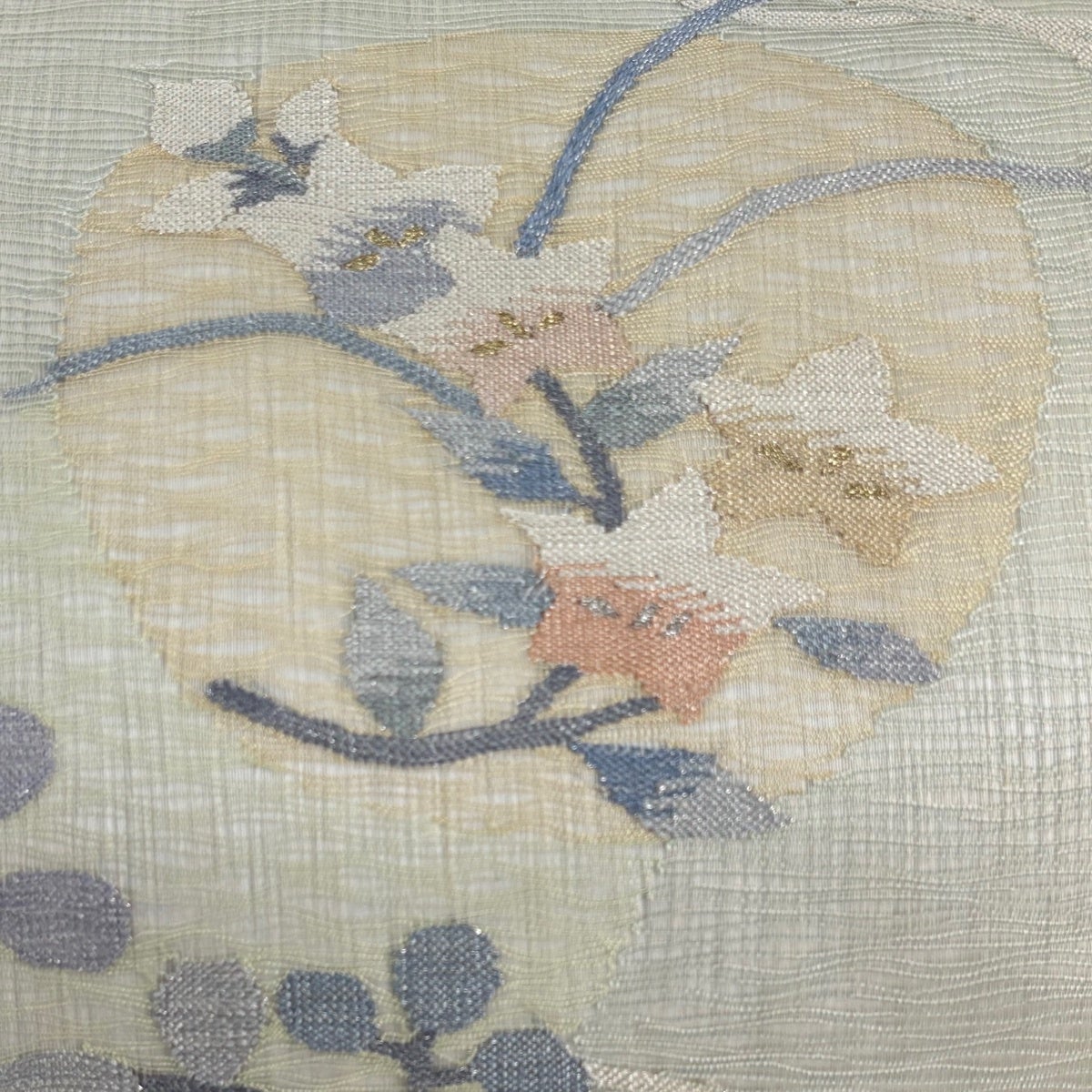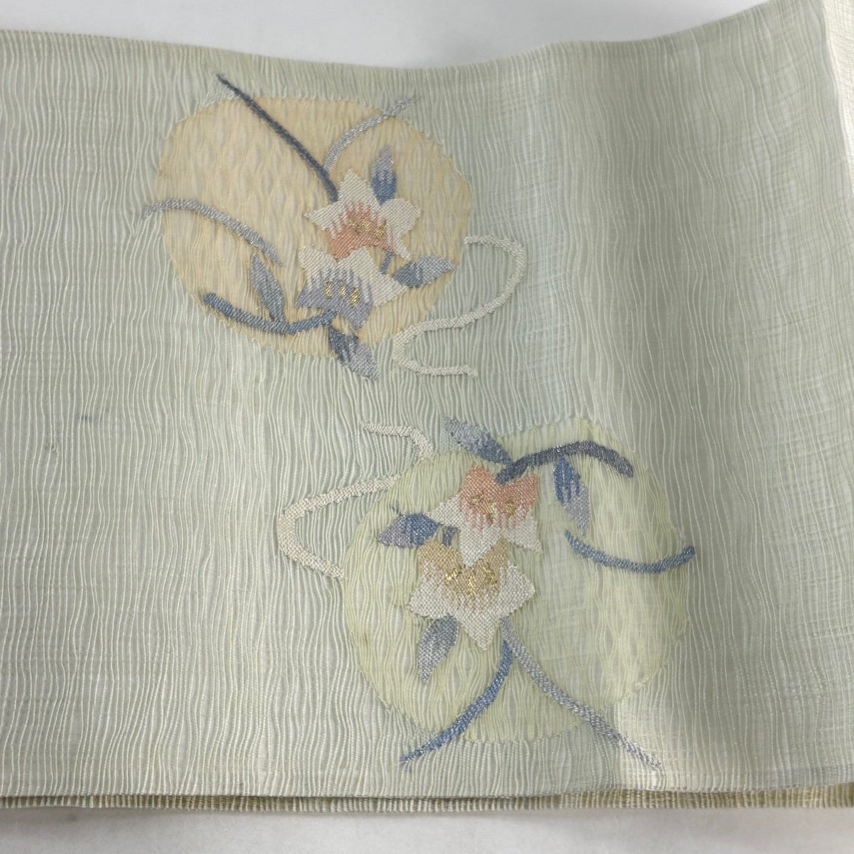 70%OFF 名古屋帯 秀品 草花 霞 螺鈿 金彩 薄緑 正絹 K70