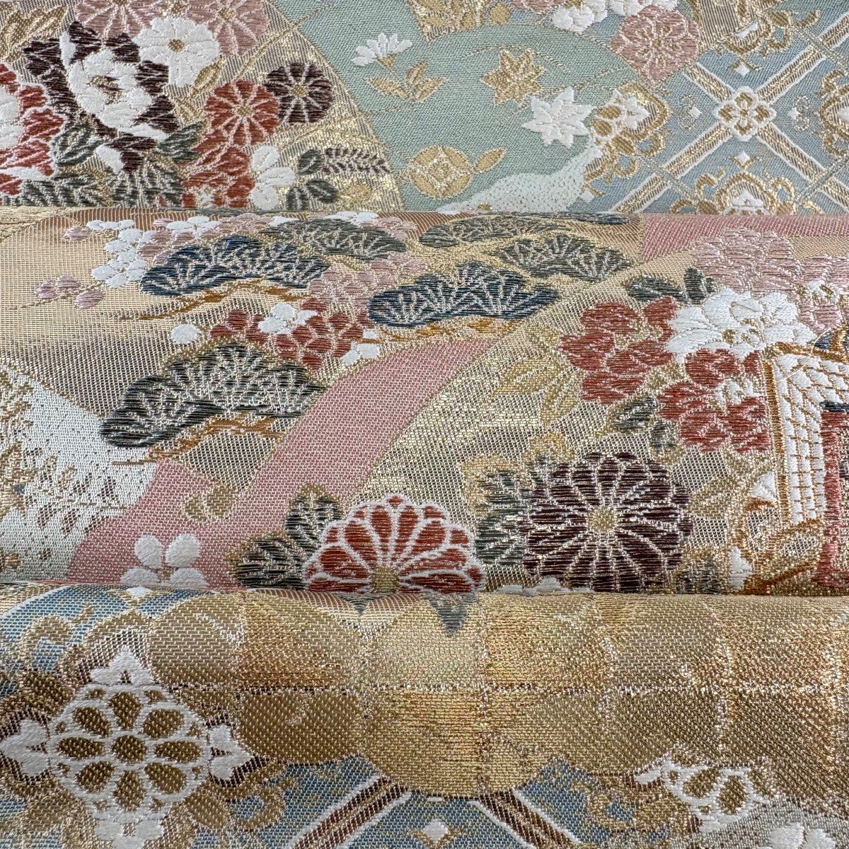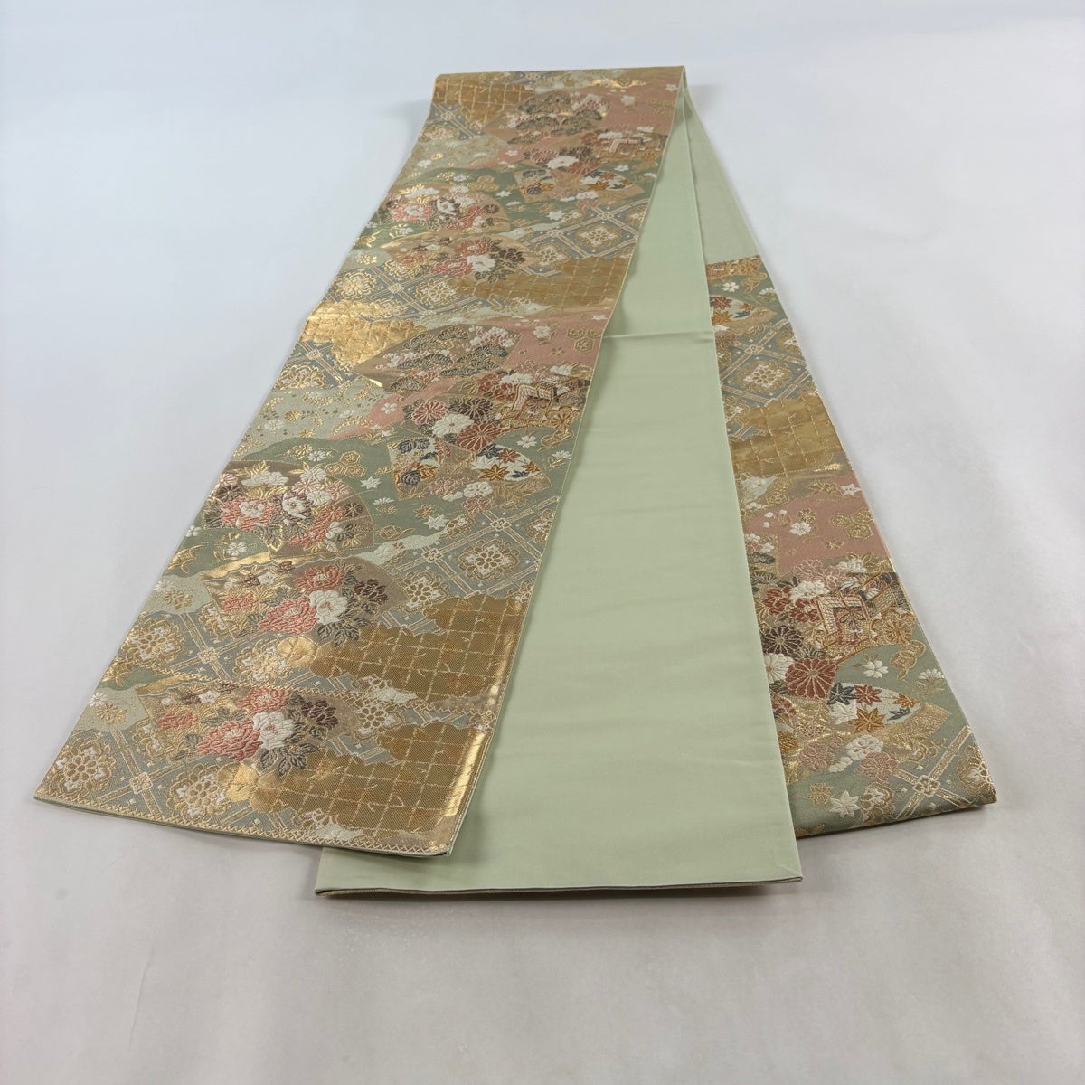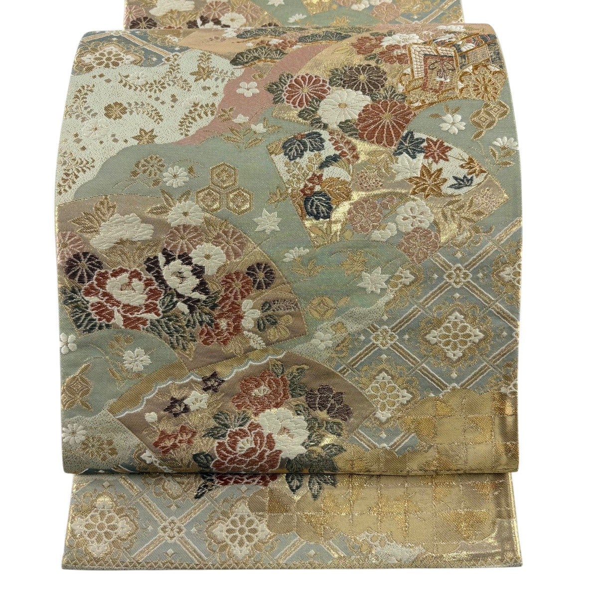【美品】 袋帯 秀品 関西仕立て 扇面 草花 箔 金糸 薄緑 六通 正絹