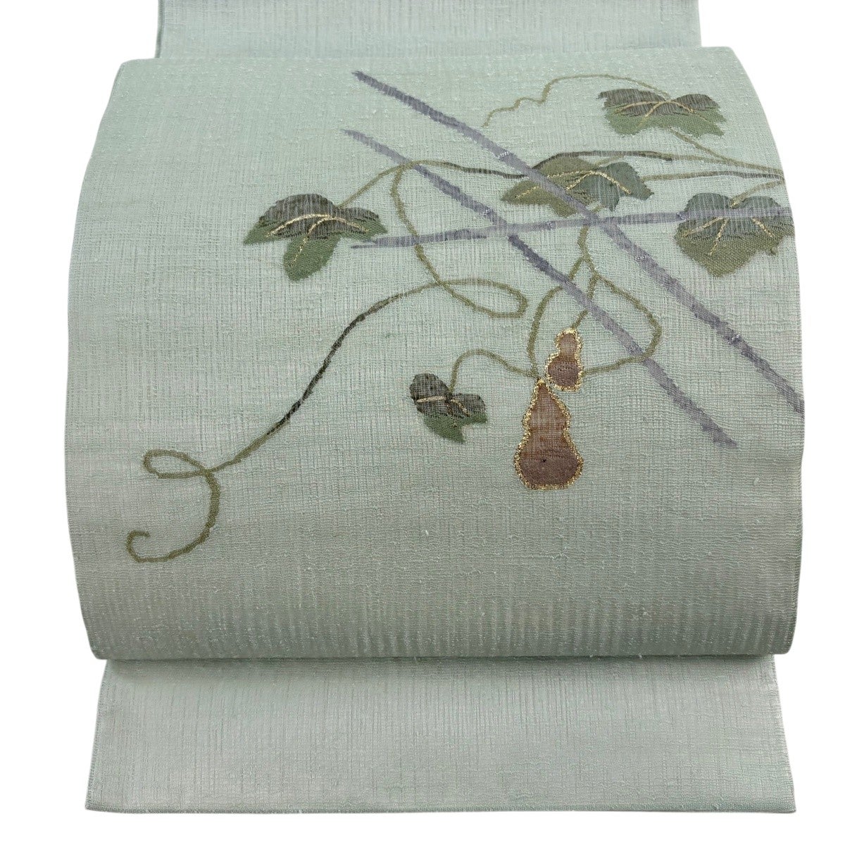 50%OFF 袋帯 秀品 笛 草花 金糸 箔 薄緑 六通 正絹 K50