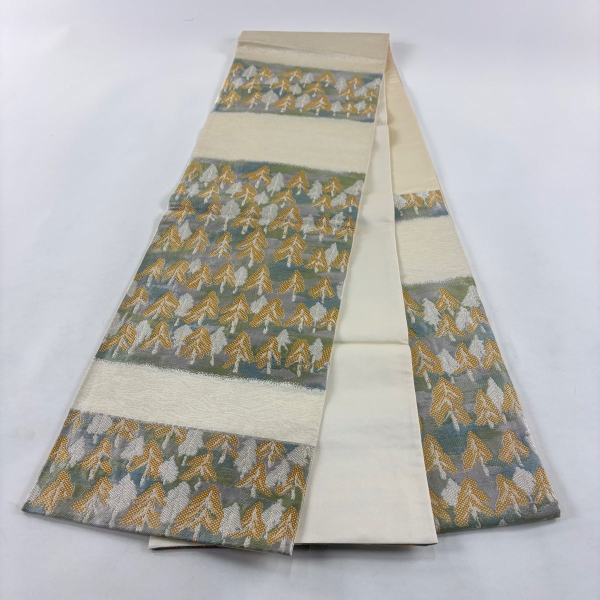 【美品】 袋帯 秀品 扇面 松梅 金銀糸 箔 薄緑 六通 正絹