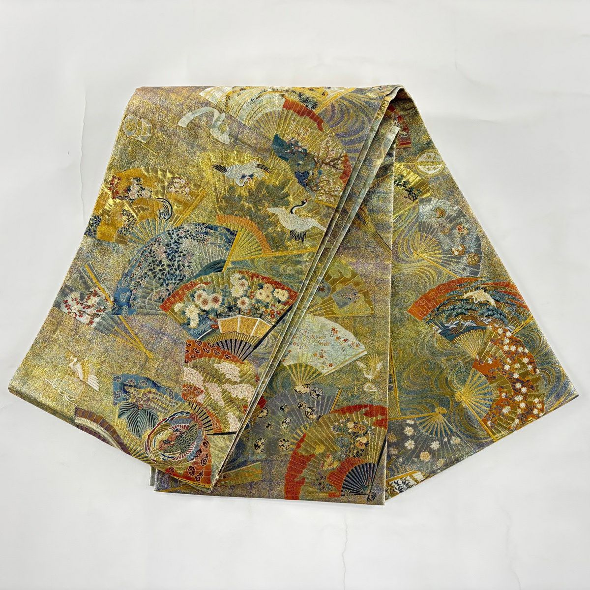 袋帯 名品 落款あり 徳川美術館秘蔵 扇 花鳥 箔 金糸 薄緑 お太鼓柄 正絹