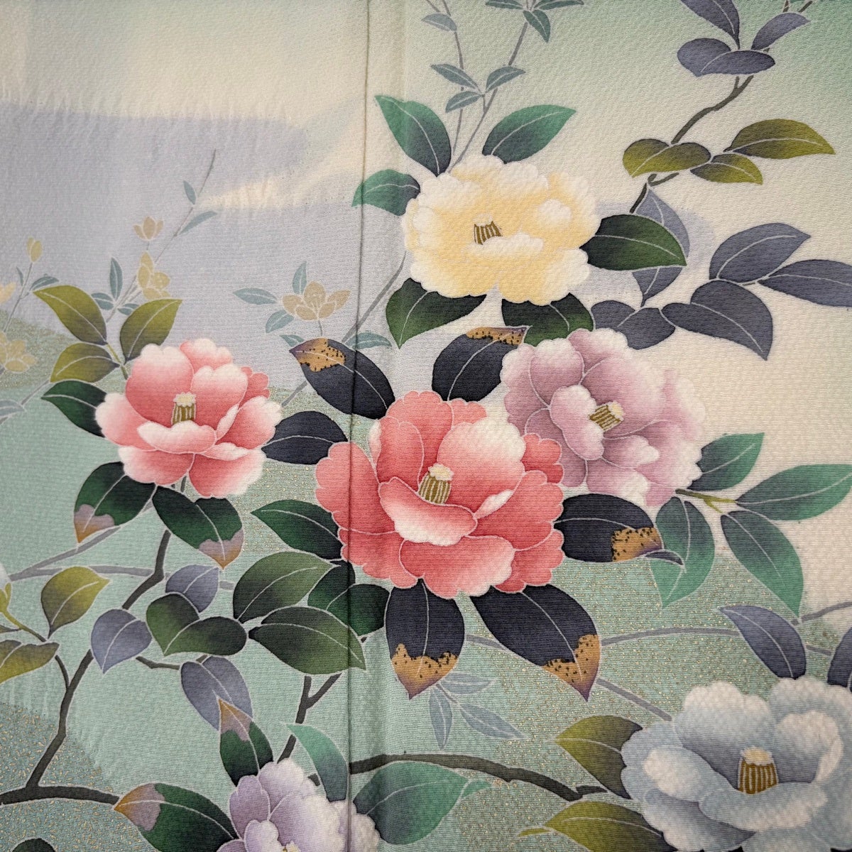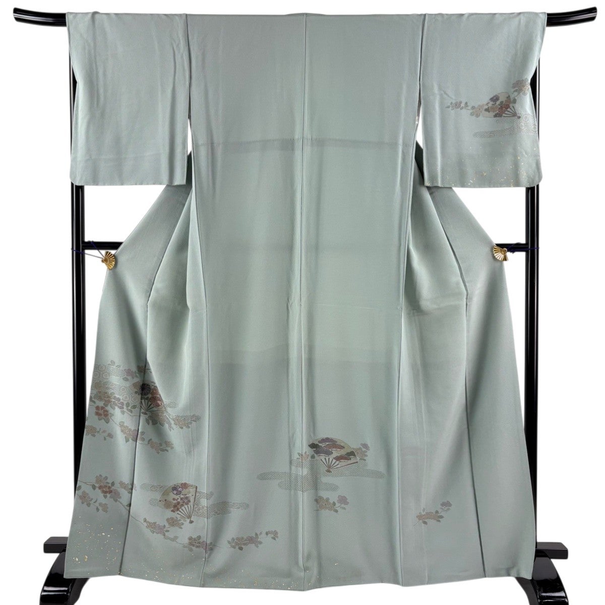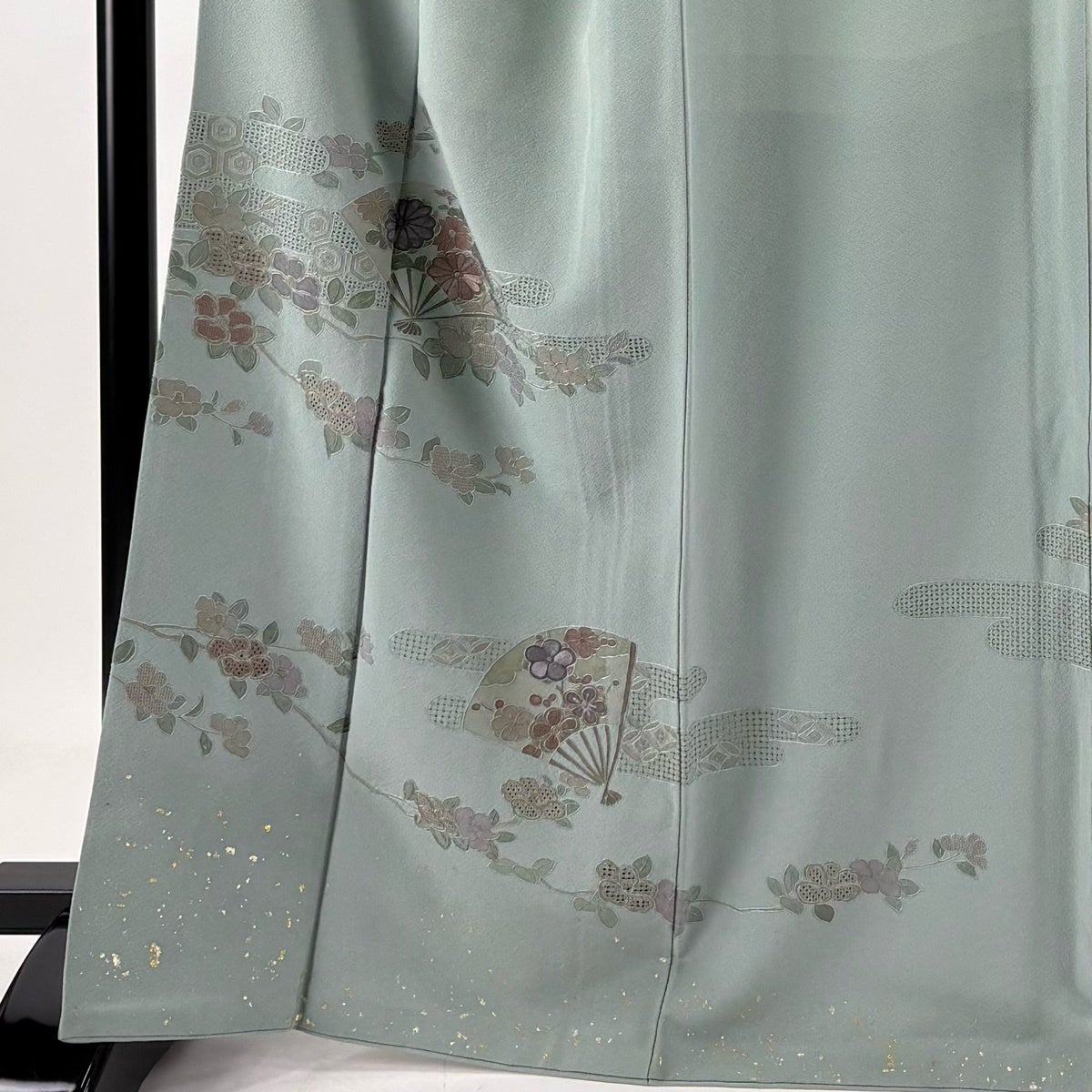 付下げ 身丈167cm 裄丈67.5cm L 袷 扇 椿 刺繍 金彩 薄緑 正絹 秀品