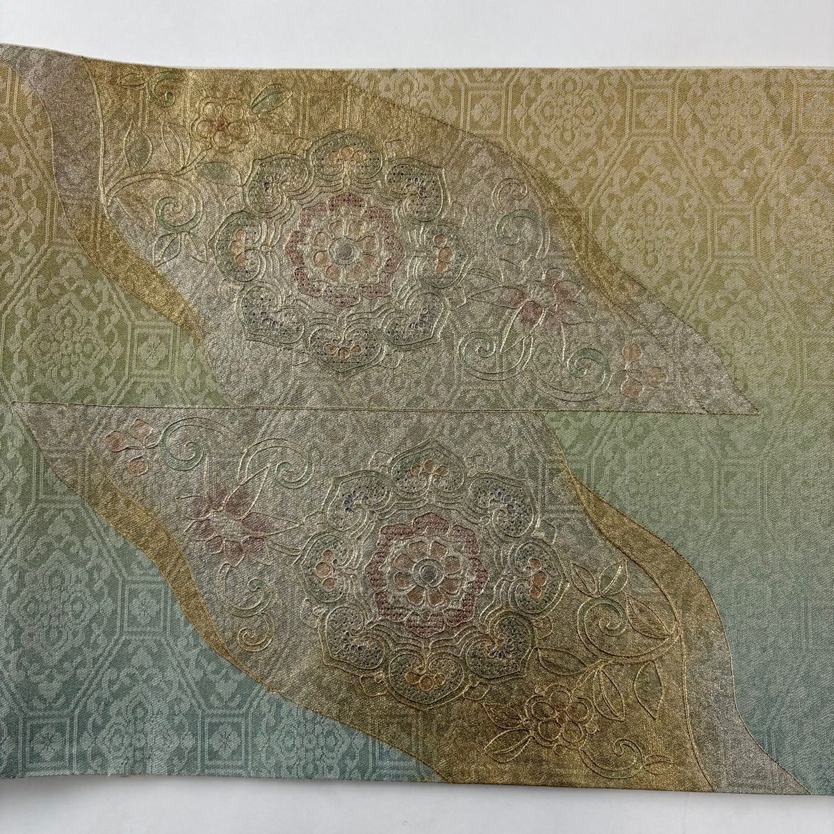 【美品】 袋帯 秀品 関西仕立て 華文 花唐草 銀糸 金銀彩 薄緑 お太鼓柄 正絹