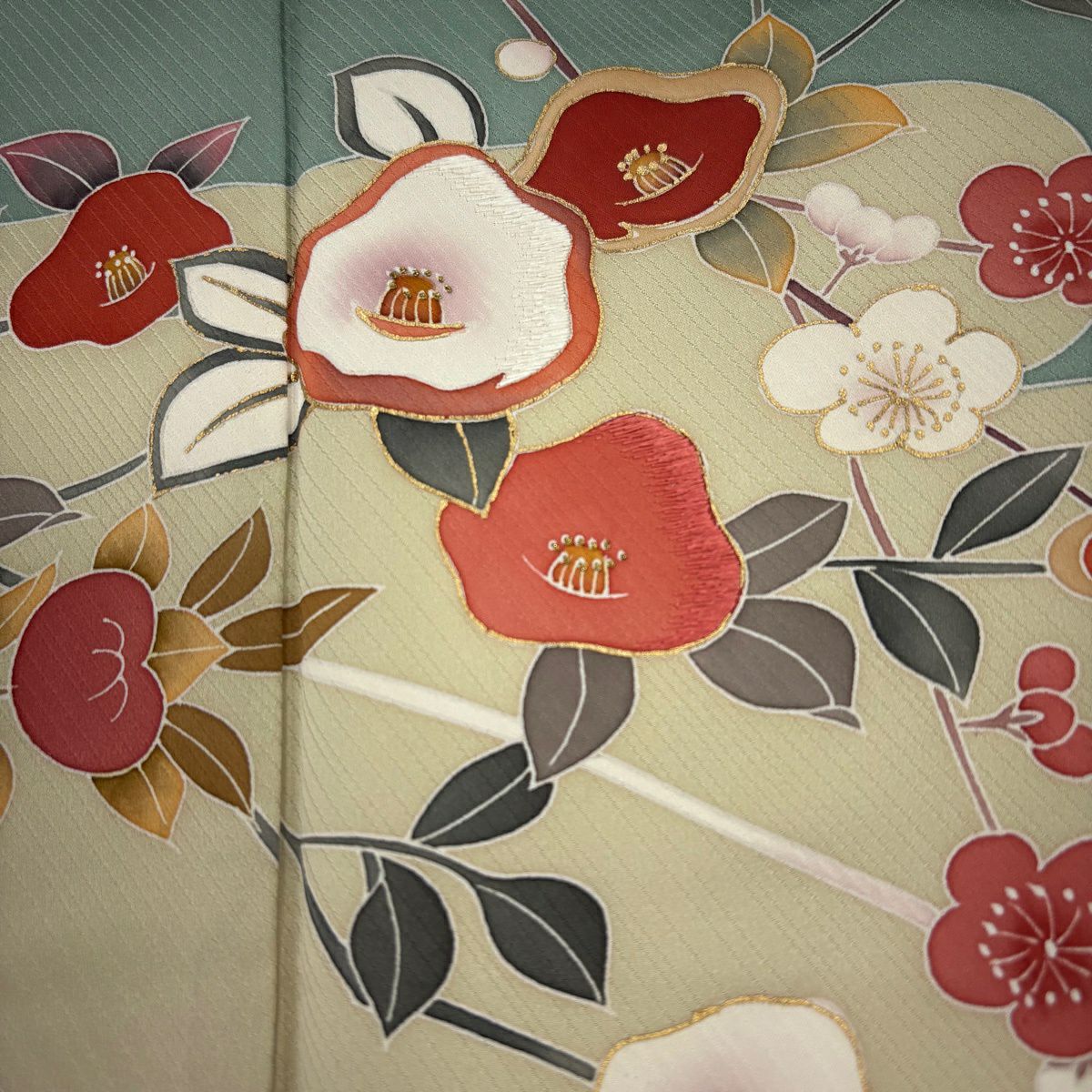 【在庫一掃】 訪問着 身丈166cm 裄丈64cm M 袷 橘花 椿 金糸 刺繍 薄緑 正絹 名品