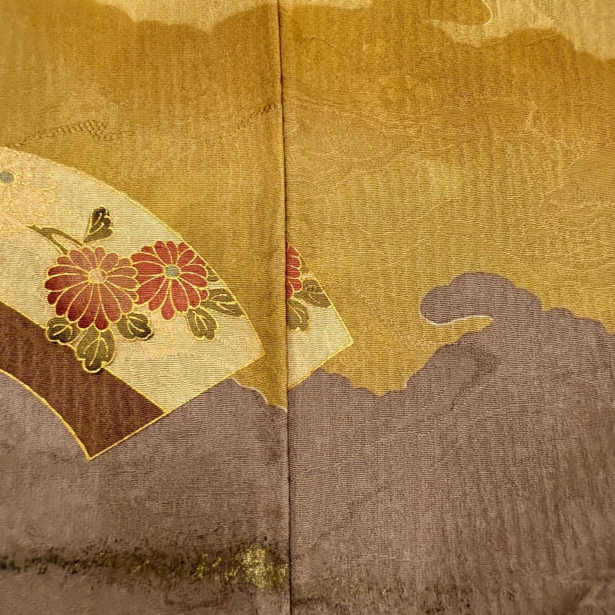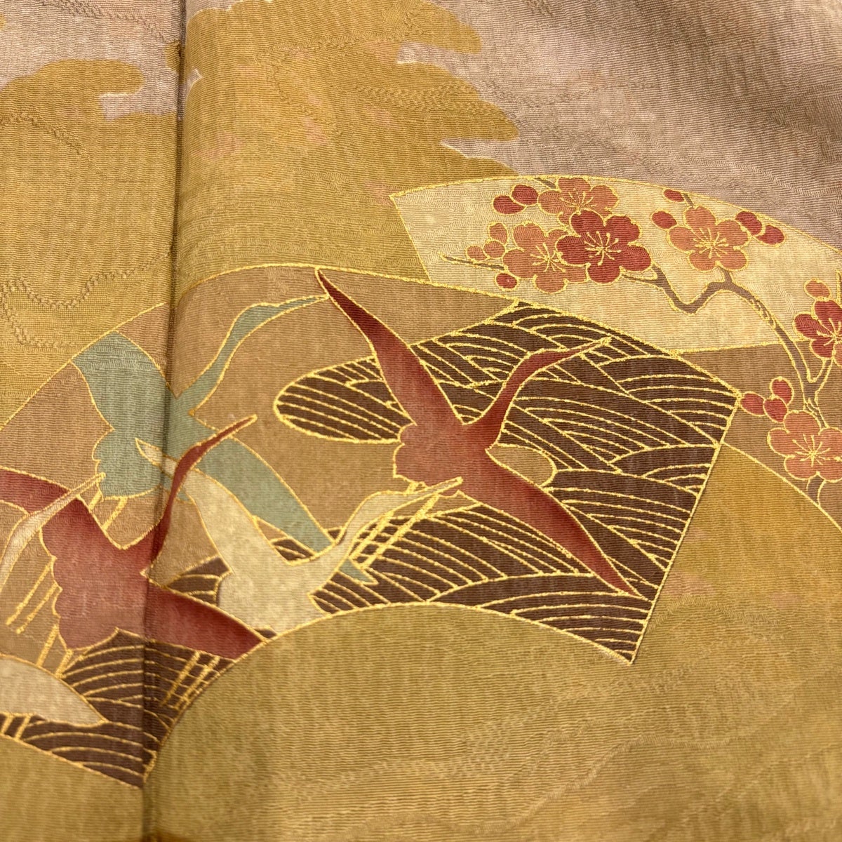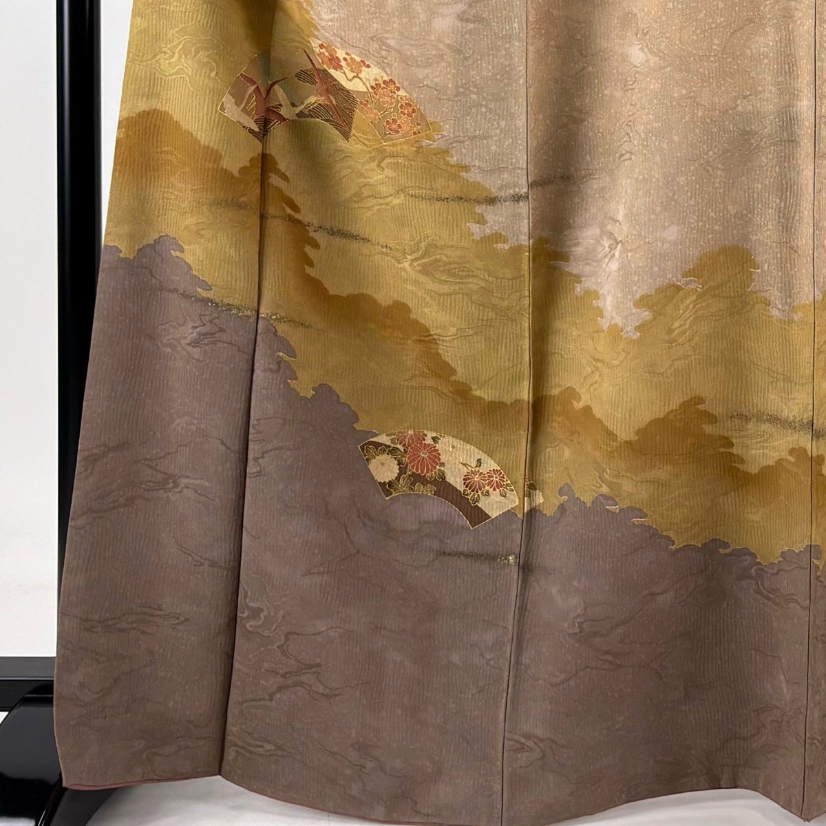 訪問着 身丈167.5cm 裄丈67cm M 袷 扇面 鶴 金彩 染め分け 薄茶色 正絹 優品