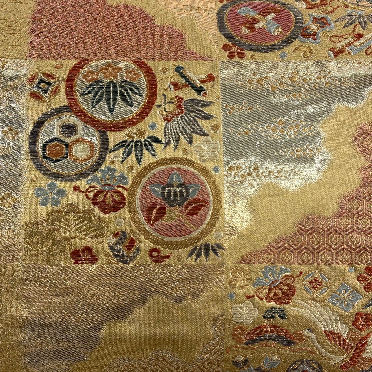 袋帯 秀品 唐織北山綴 尾長鳥 扇 唐織 箔 薄茶色 六通 正絹