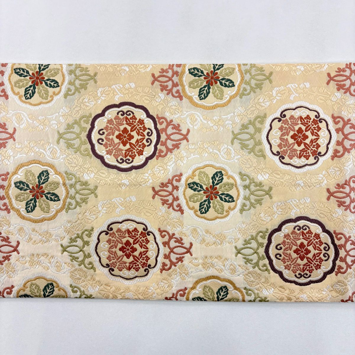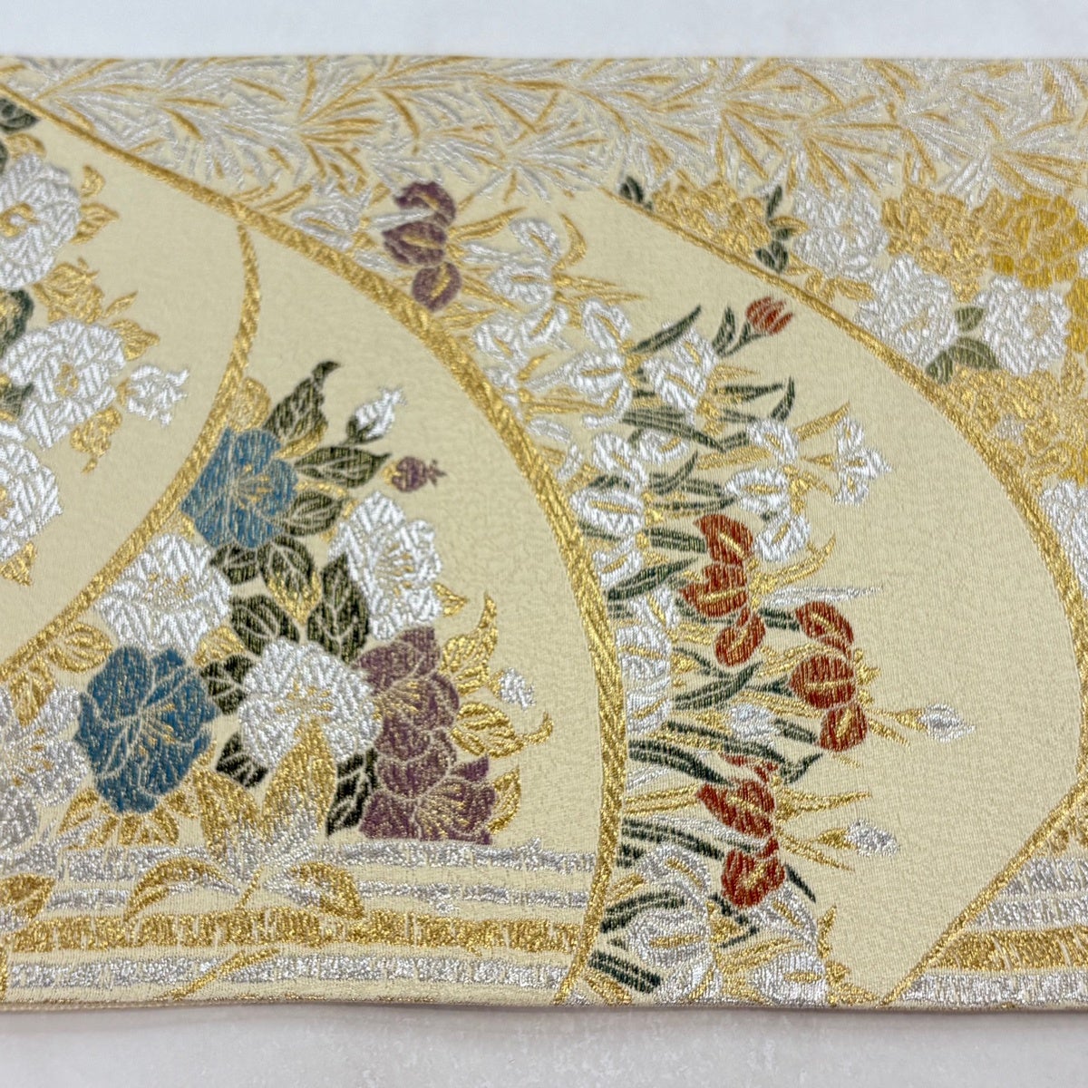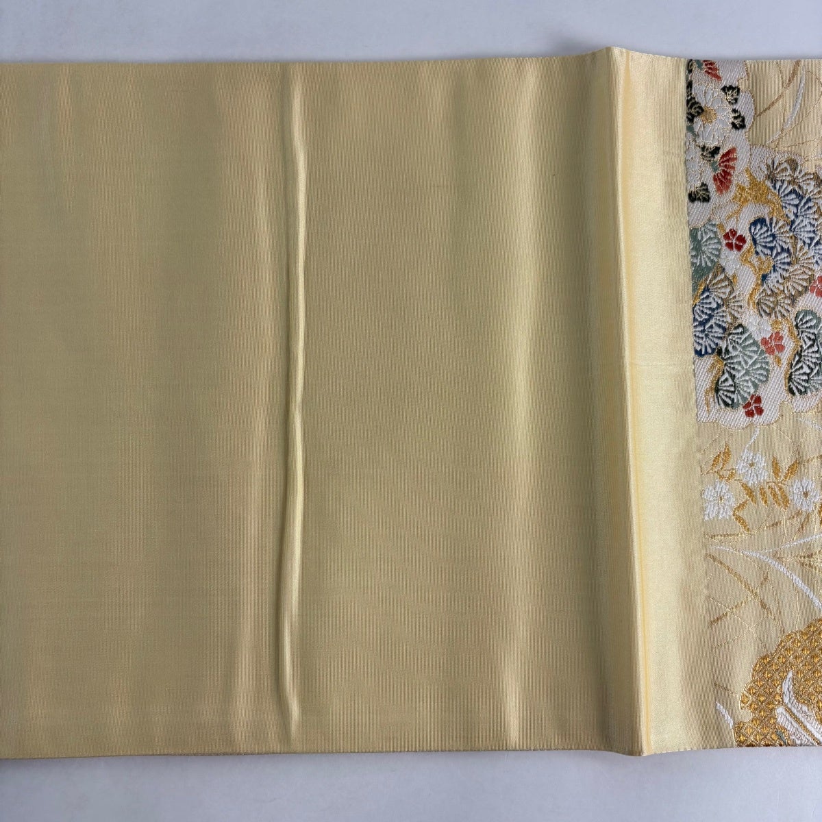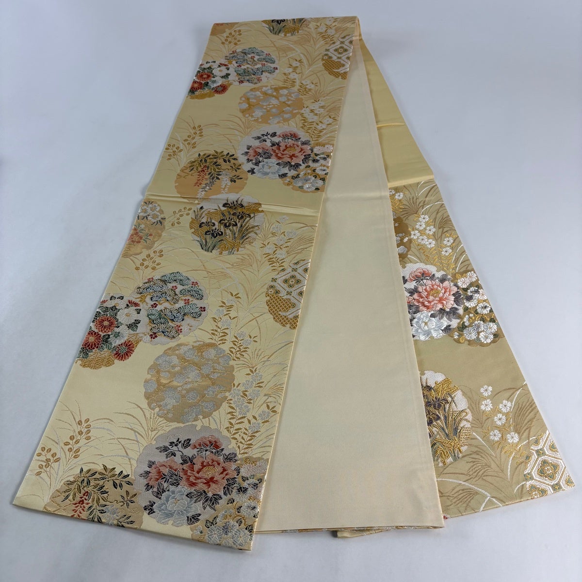 40%OFF 袋帯 逸品 雪輪 草花 金銀糸 刺繍 薄黄 六通 正絹 K30