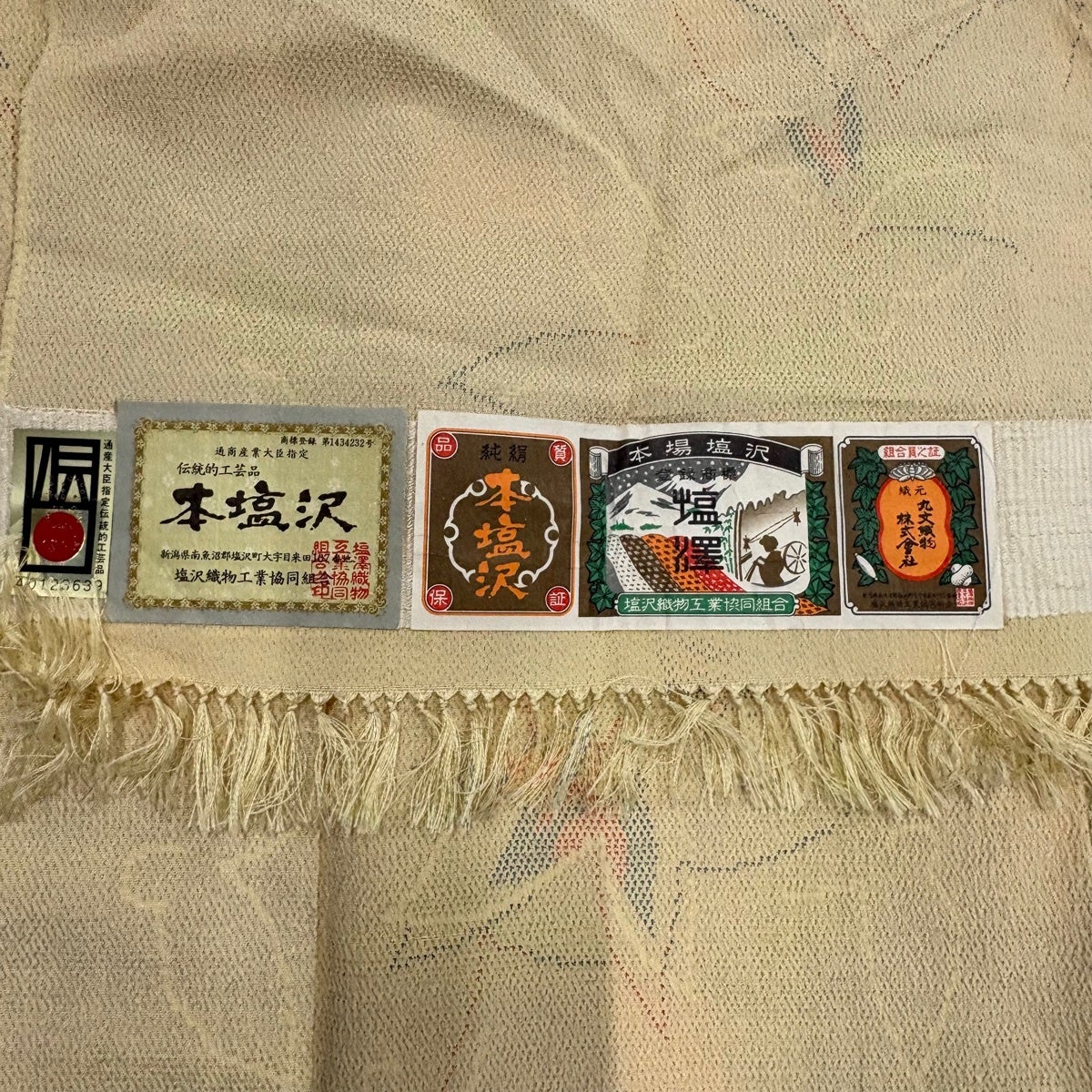 お召 身丈158cm 裄丈64cm M 袷 本塩沢 証紙あり 蝶 薄黄 正絹 逸品