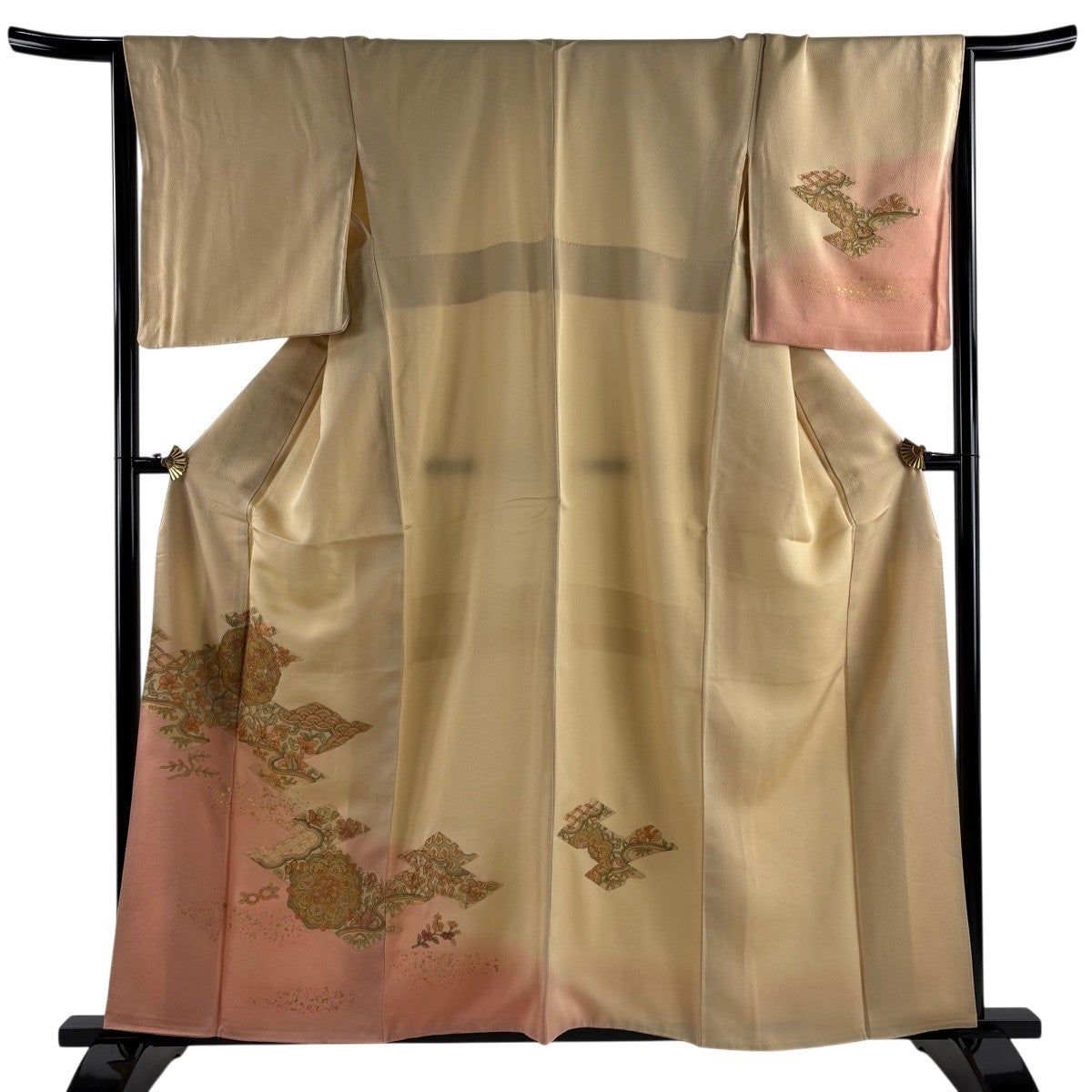 色留袖 身丈166.5cm 裄丈65.5cm M 袷 落款あり 松竹梅 建物 ぼかし 薄黄土色 正絹 名品 一つ紋
