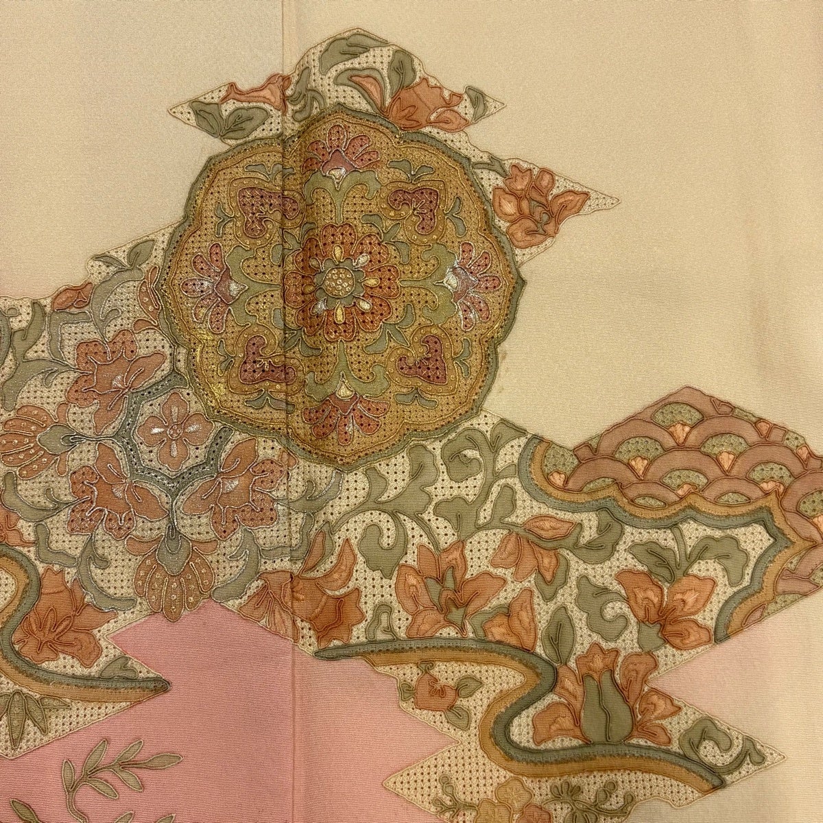 70%OFF 【美品】 袋帯 秀品 証紙あり 菱取祝宴花園 草花 刺繍 金糸 薄黄土色 六通 正絹 K70