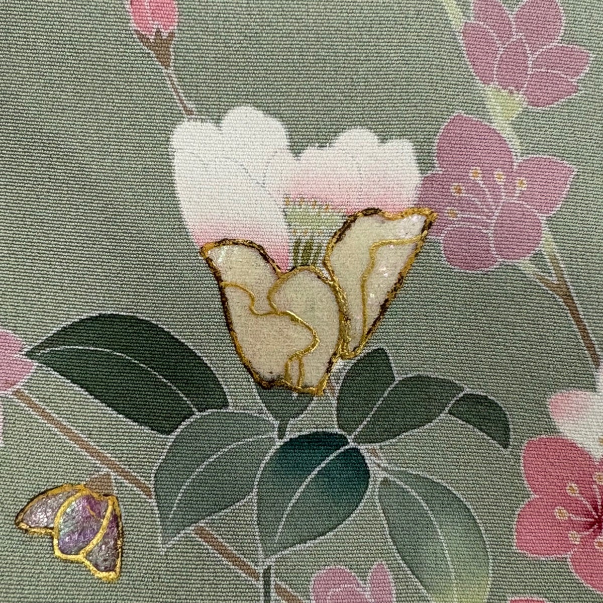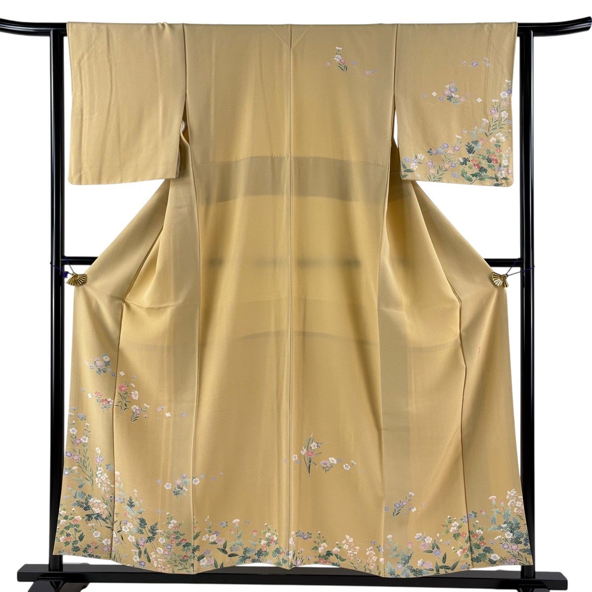 訪問着 身丈168cm 裄丈67.5cm L 袷 落款あり 草花 松 螺鈿 金彩 薄黄土色 正絹 名品