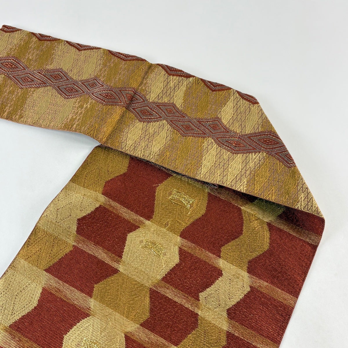 50%OFF 【美品】 名古屋帯 秀品 夏帯 八寸名古屋帯 松葉仕立て 幾何学模様 金糸 薄黄土色 正絹 K50
