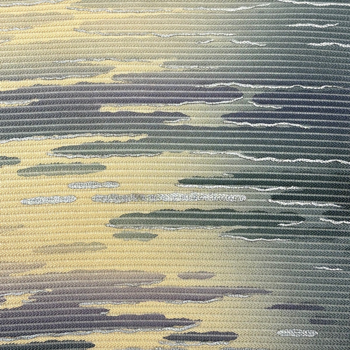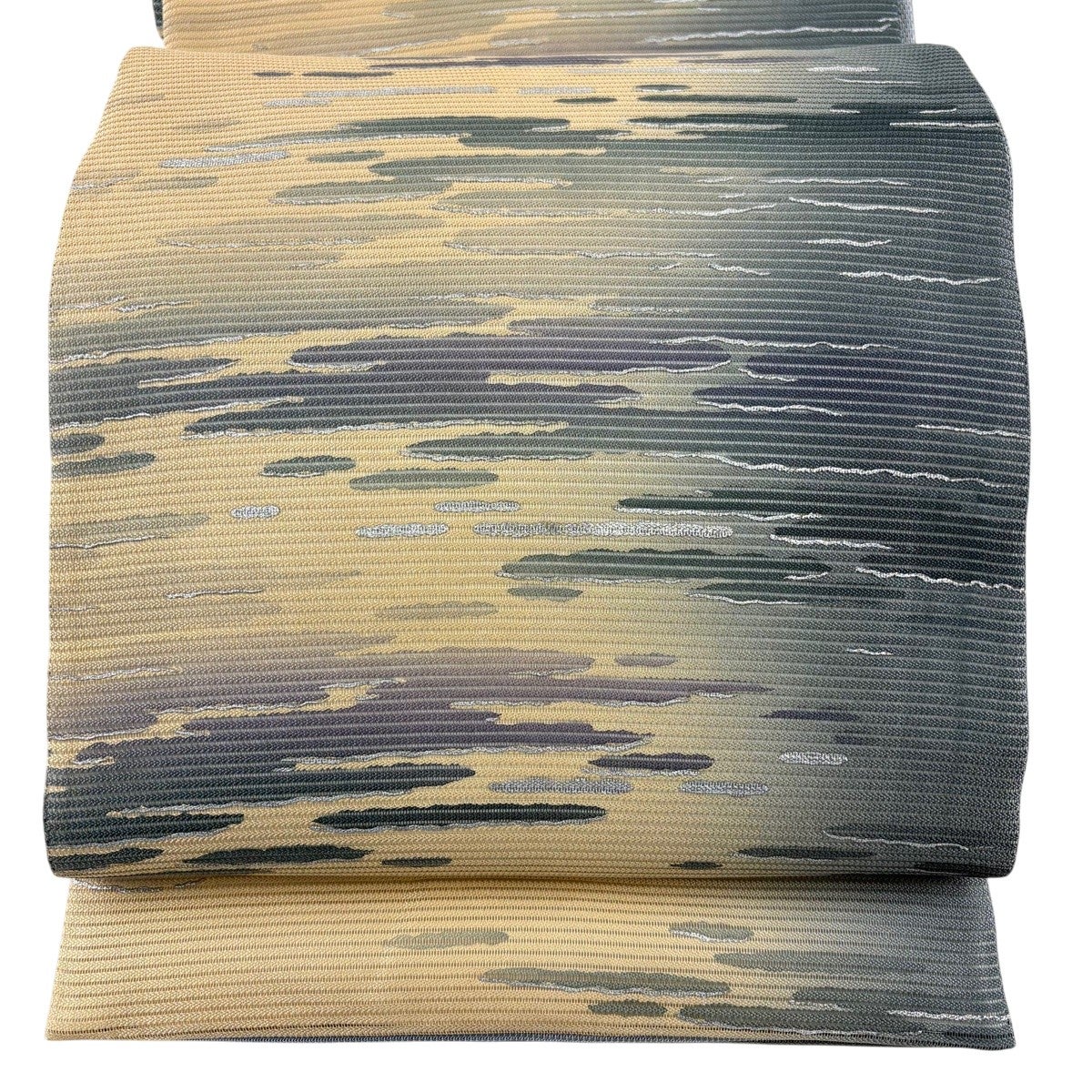 袋帯 名品 夏帯 絽 霞 銀彩 薄黄土色 全通 正絹