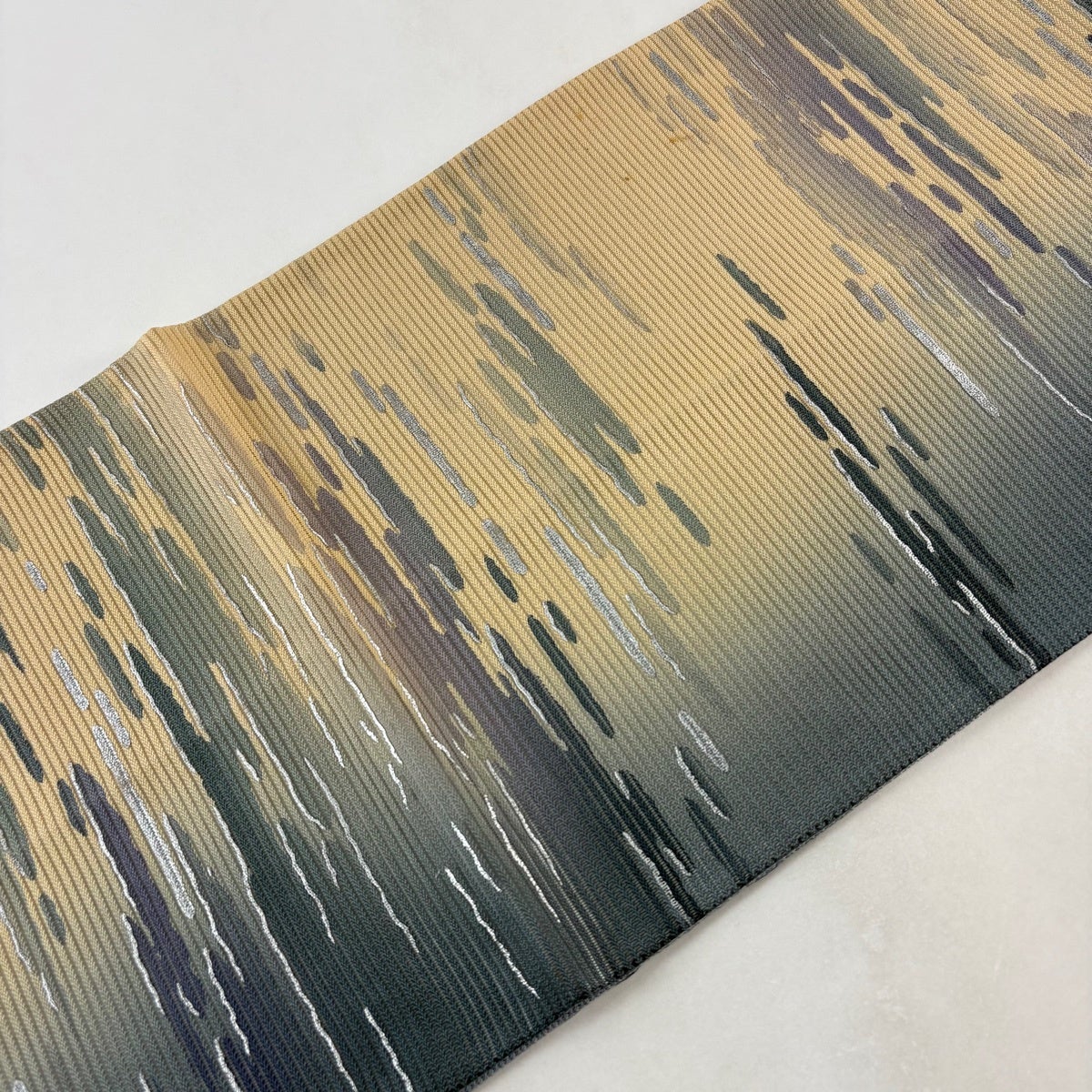 袋帯 秀品 縞 幾何学模様 薄黄土色 全通 正絹