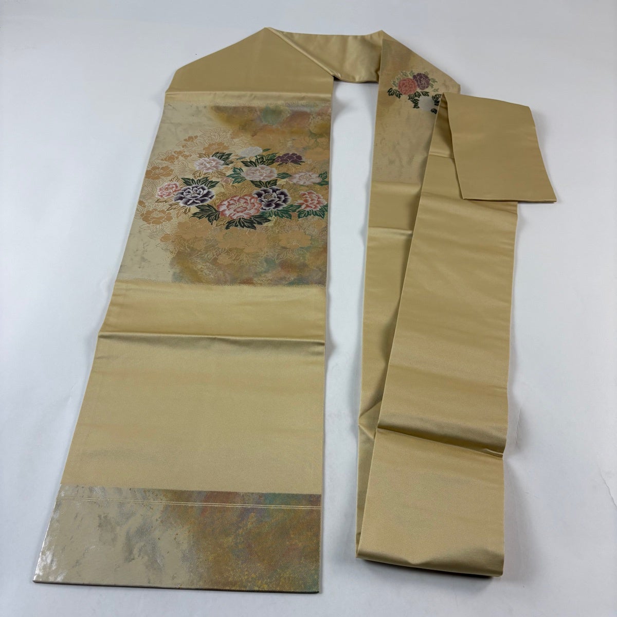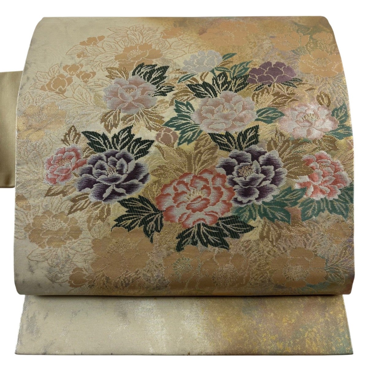 【美品】 名古屋帯 秀品 牡丹 金糸 箔 薄黄土色 正絹