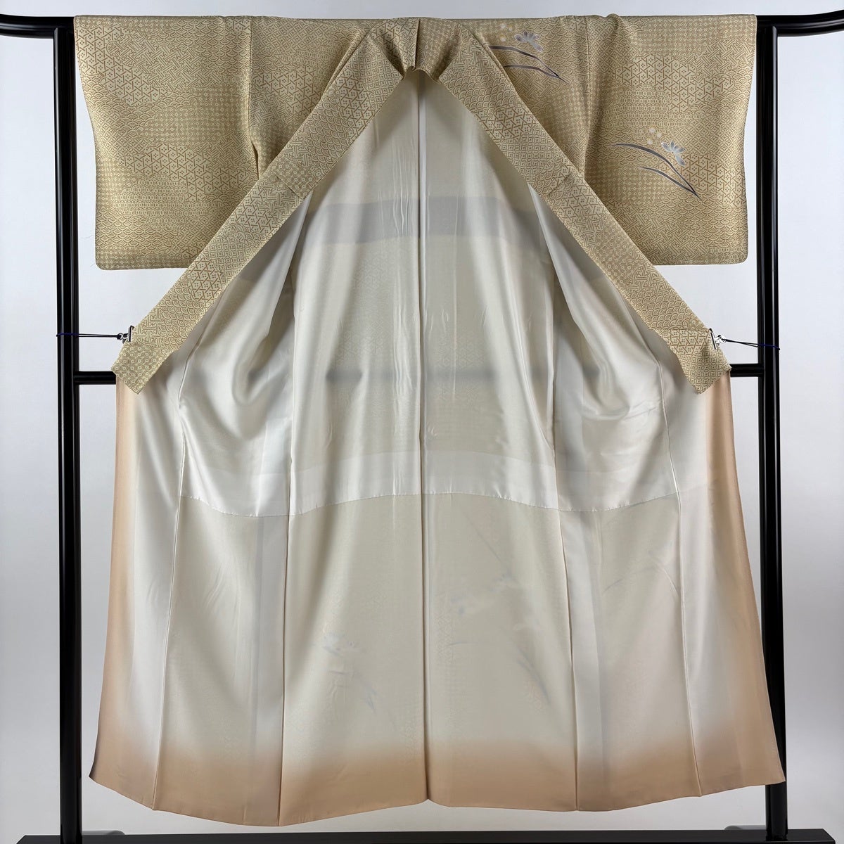 訪問着 身丈154.5cm 裄丈65cm M 単衣 亀甲 桜 刺繍 金糸 薄黄土色 正絹 秀品