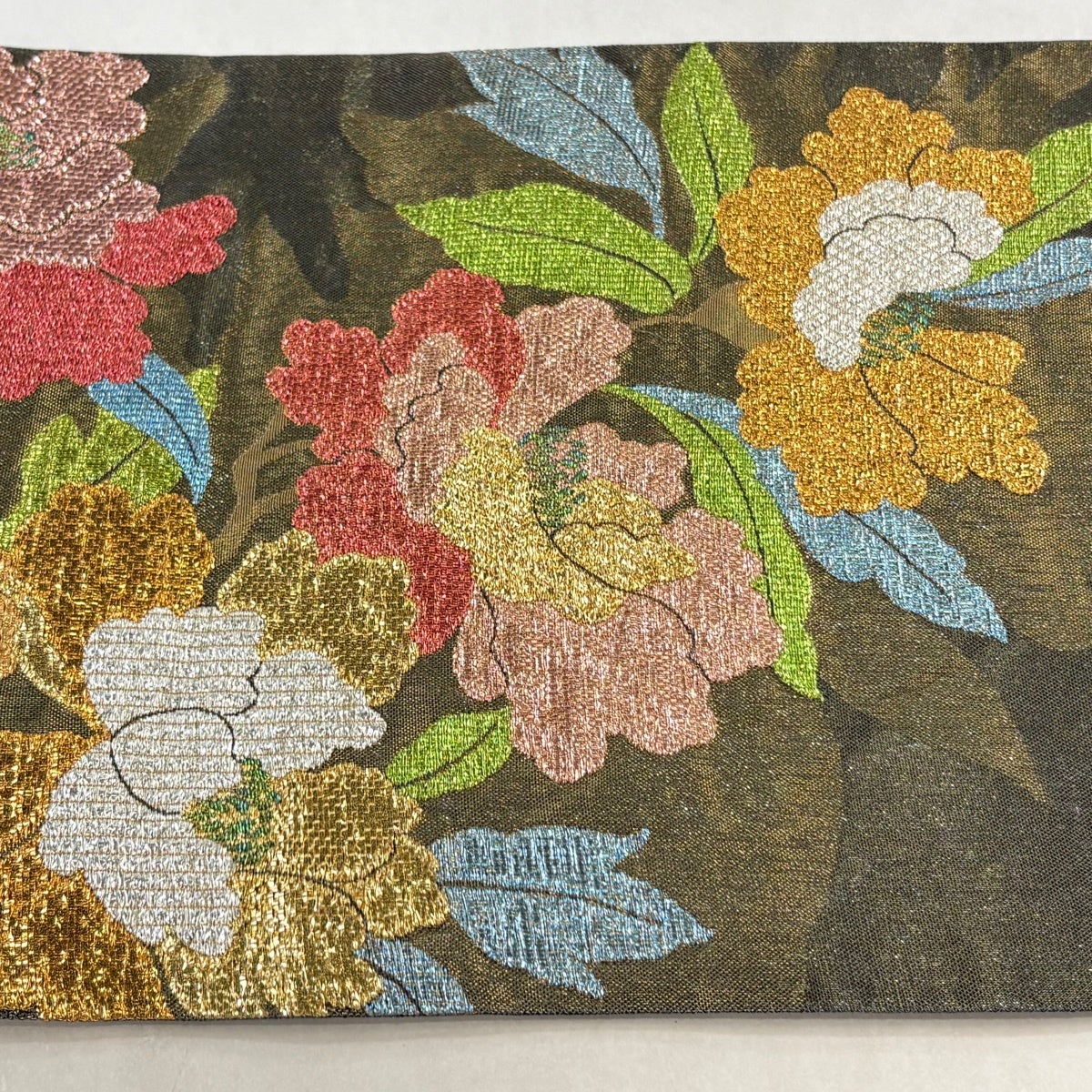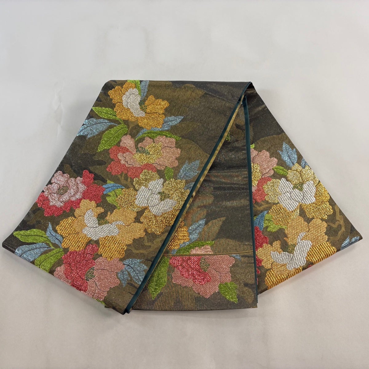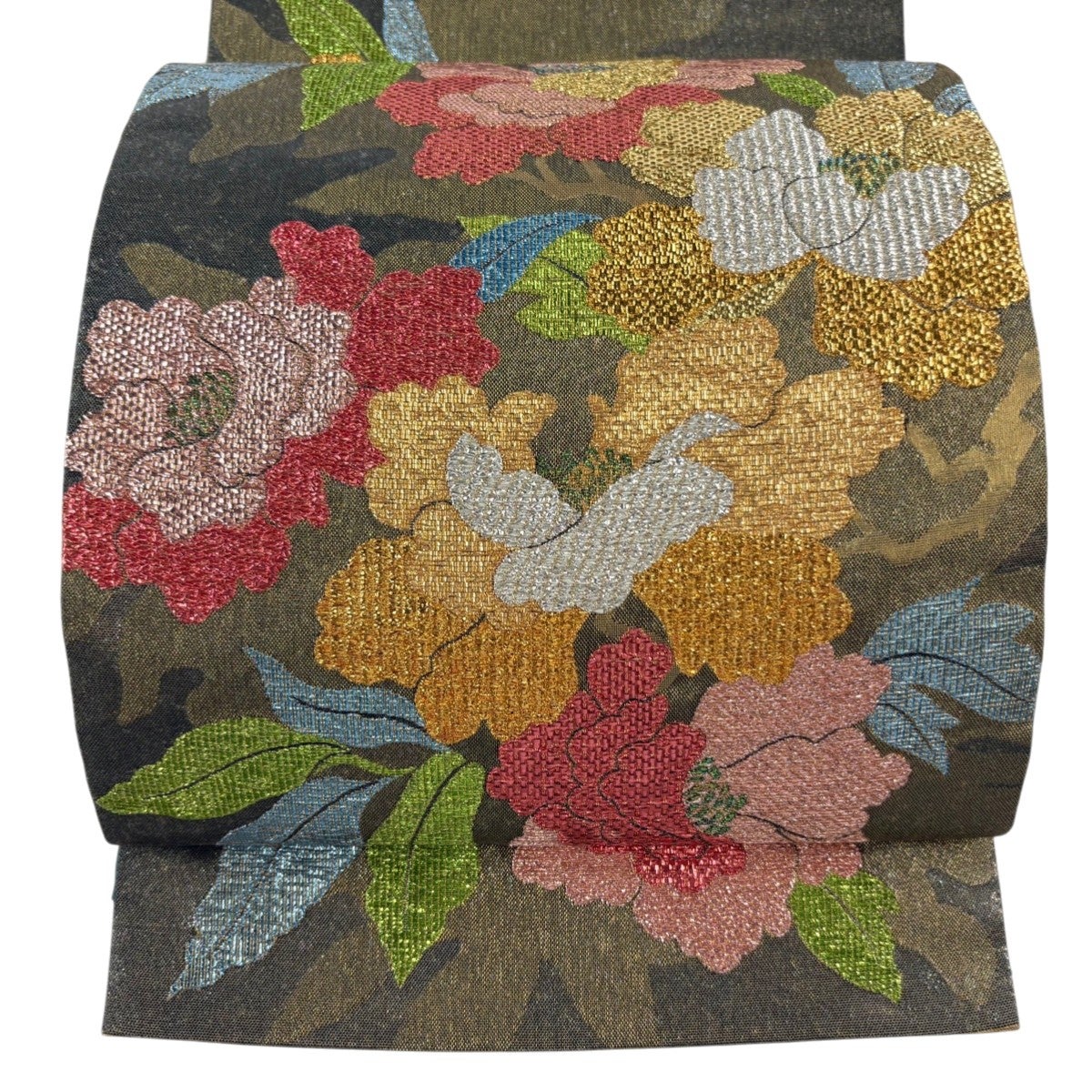 【美品】 袋帯 秀品 牡丹 萩 金糸 箔 灰茶 六通 正絹
