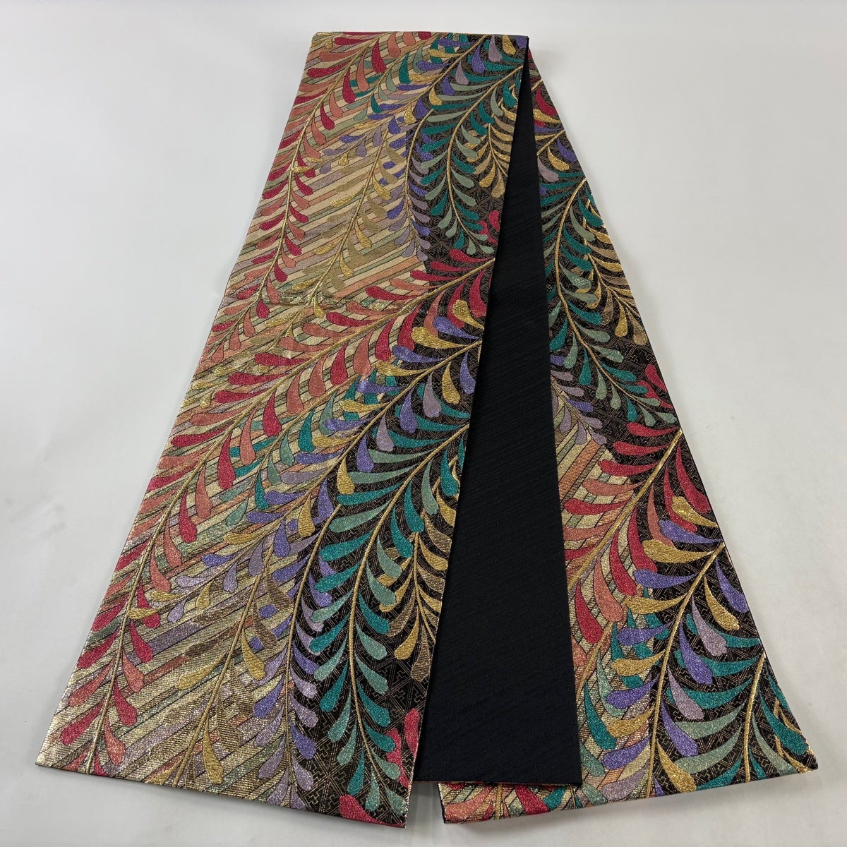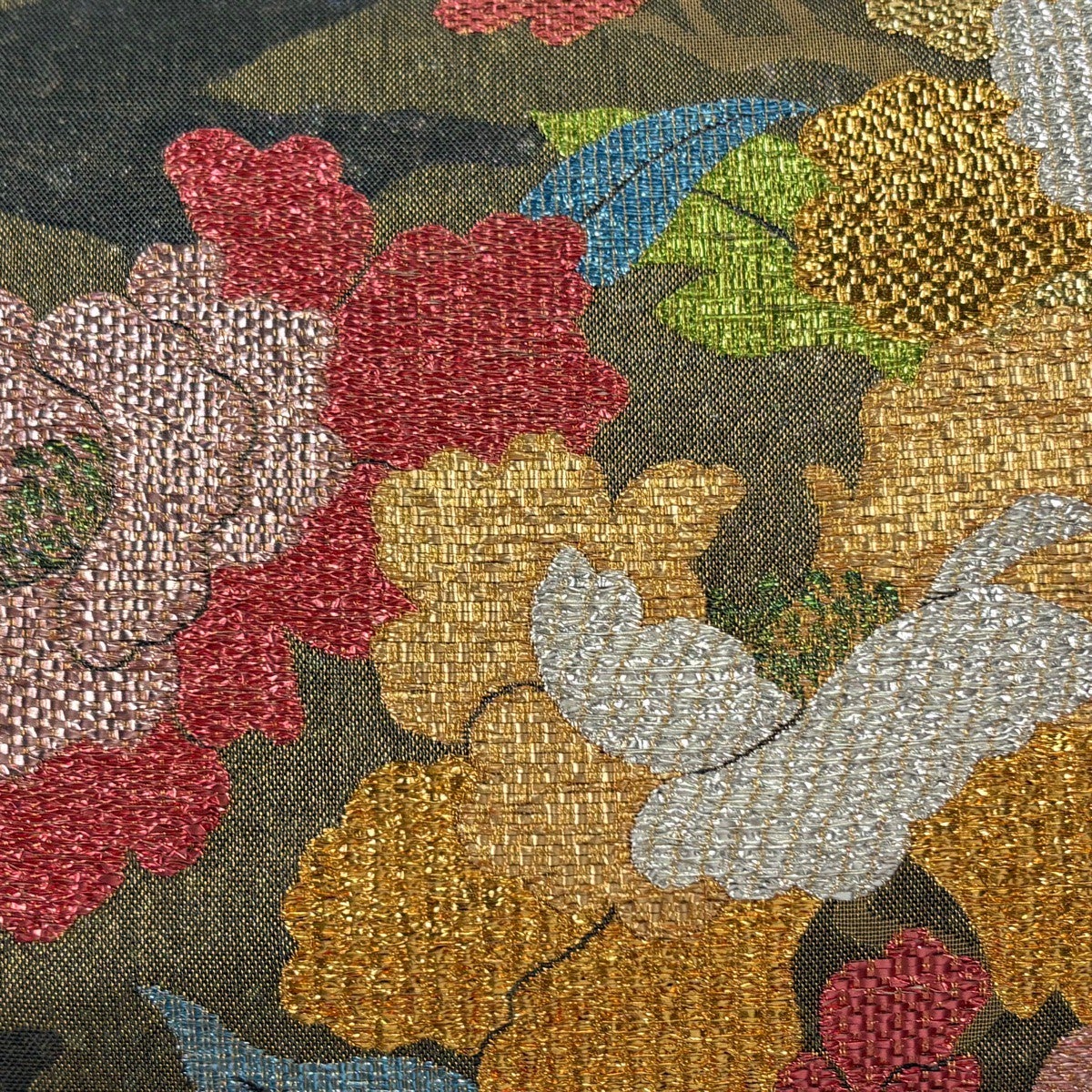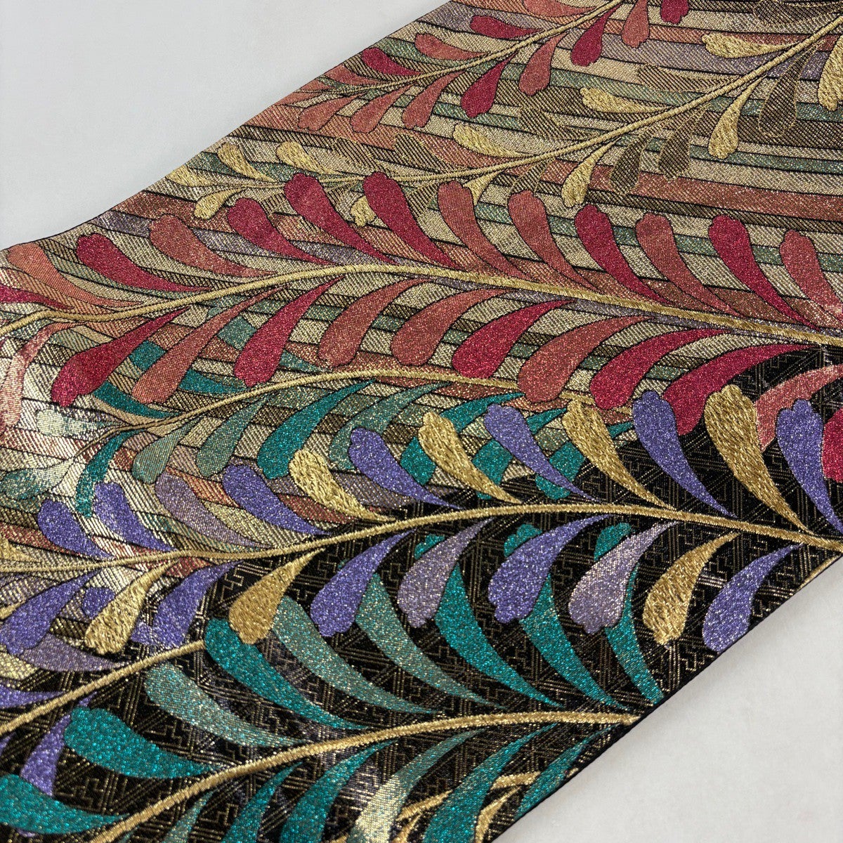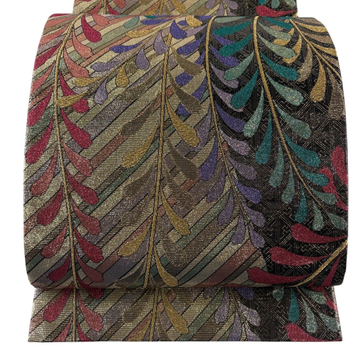 【美品】 袋帯 秀品 草木染 菱 草花 箔 墨色 全通 正絹