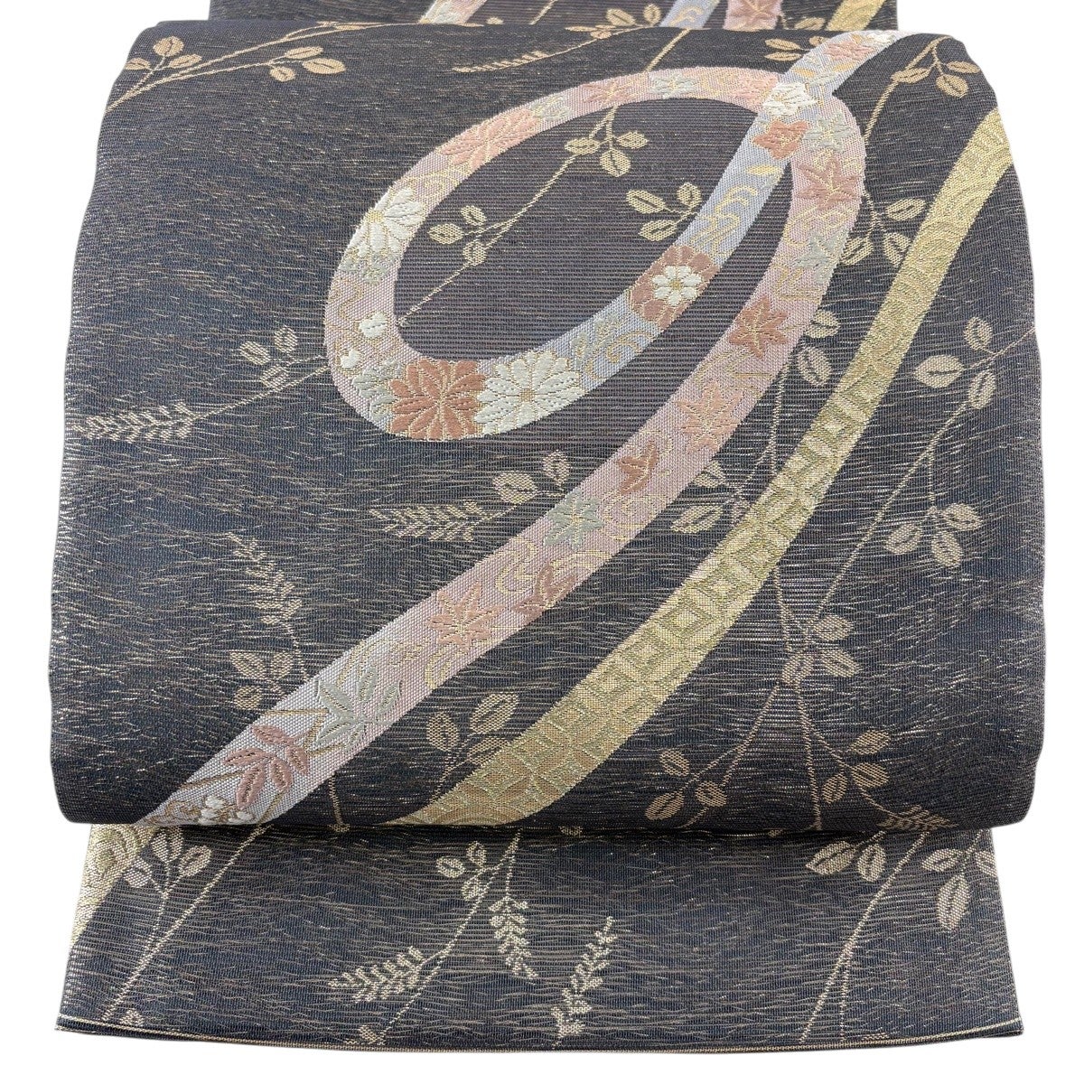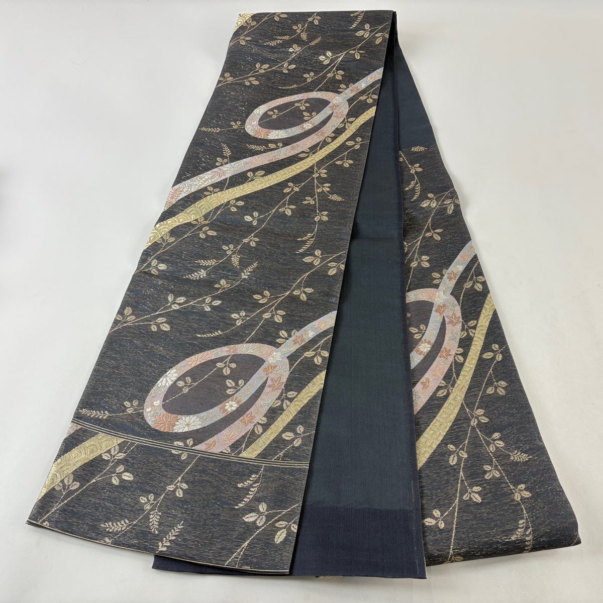 30%OFF 【美品】 袋帯 秀品 扇 草花 金糸 箔 銀色 六通 正絹 K30