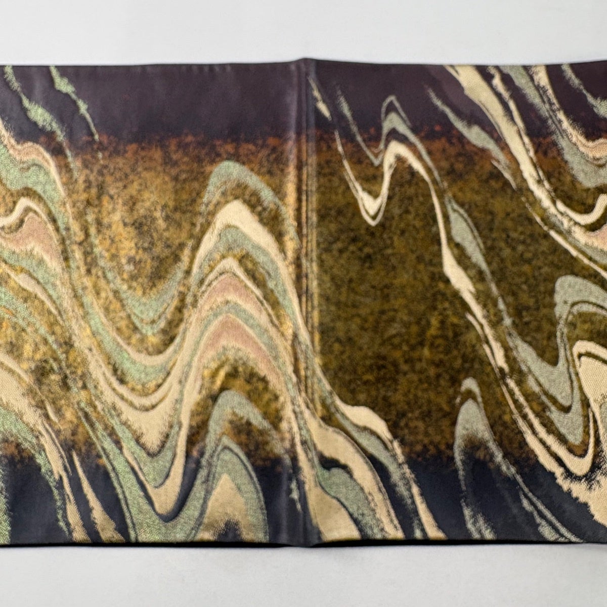 袋帯 名品 落款あり 辻が花 格子 箔 銀糸 灰緑 お太鼓柄 正絹