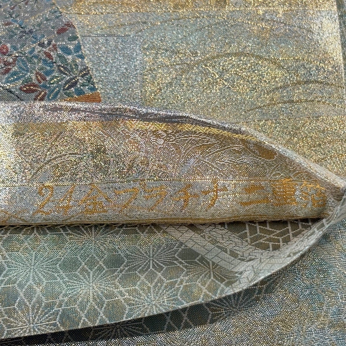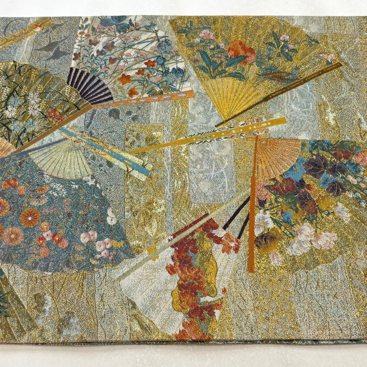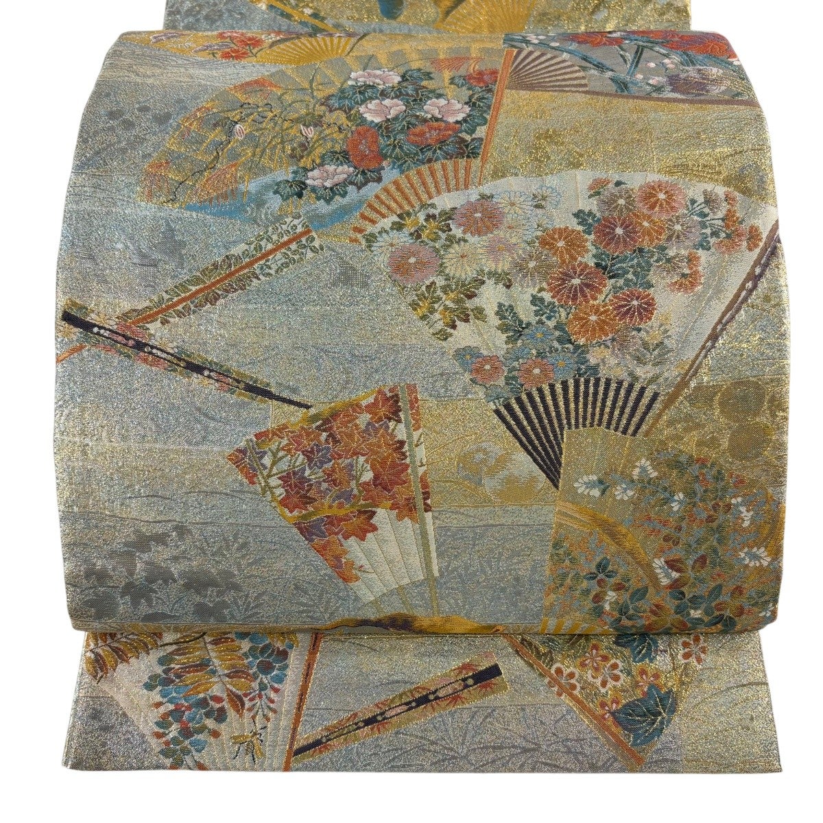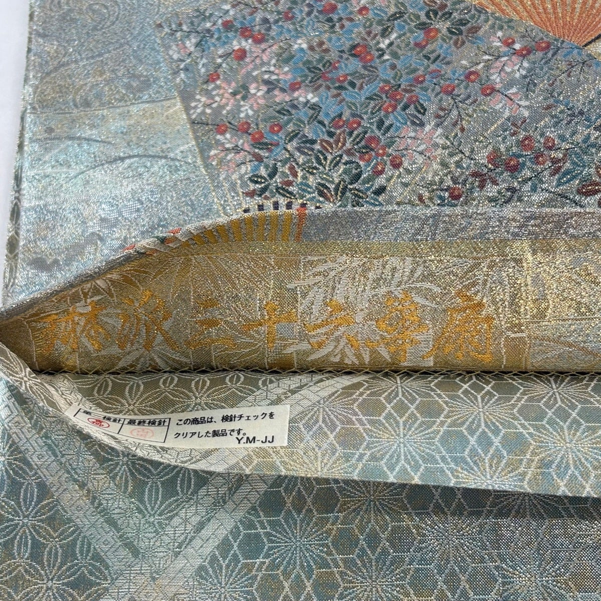 【美品】 袋帯 名品 琳派三十六華扇 ・ 金糸 箔 灰緑 六通 正絹