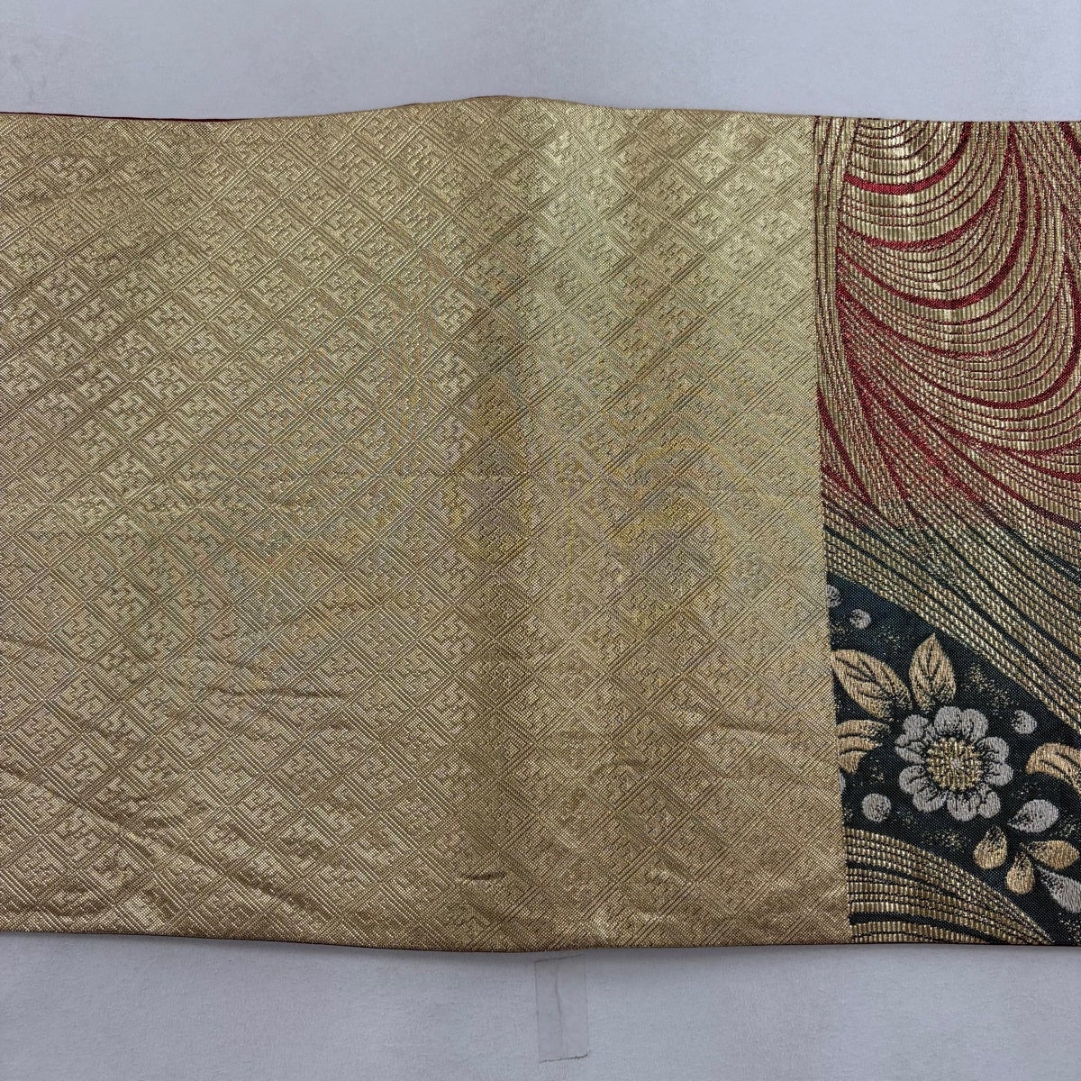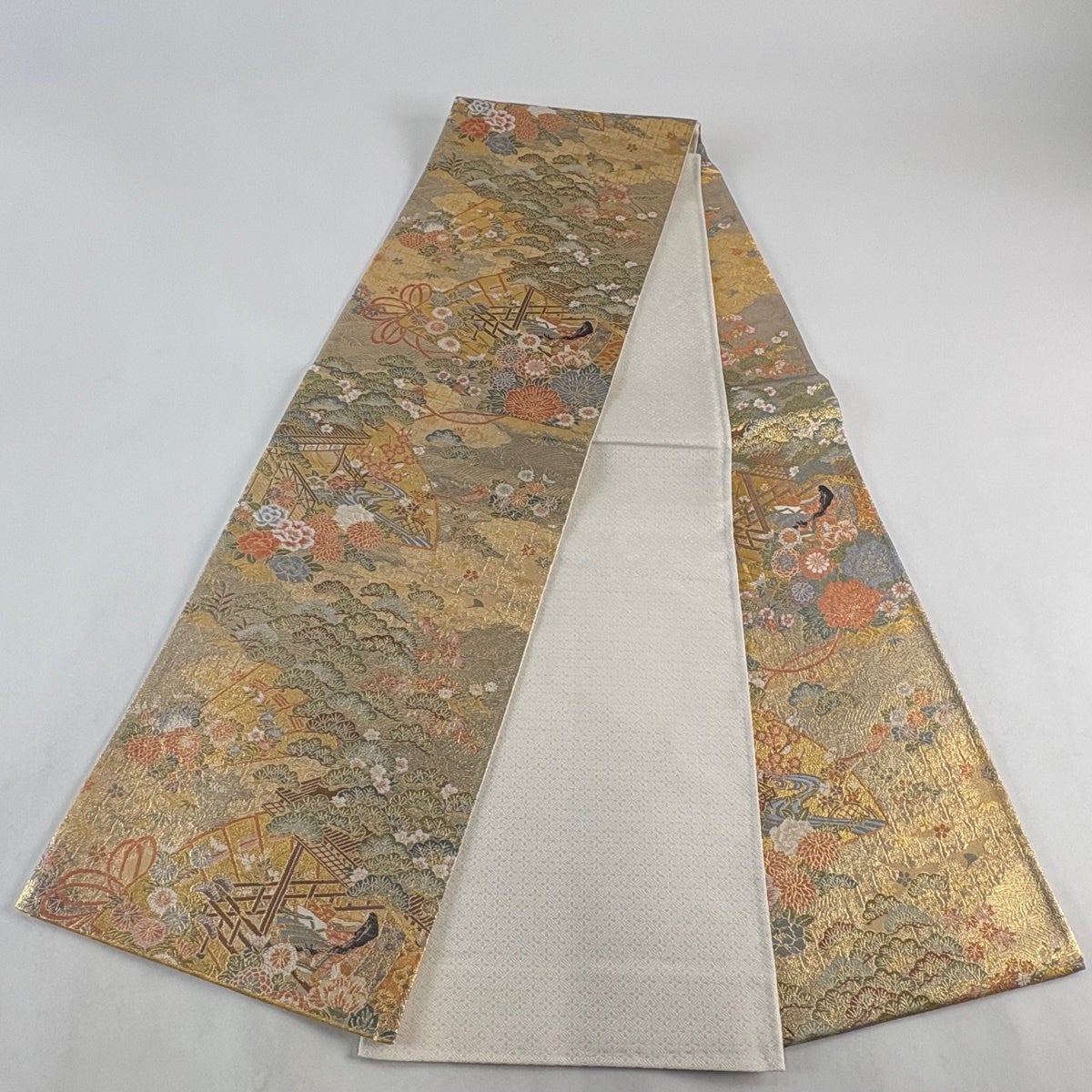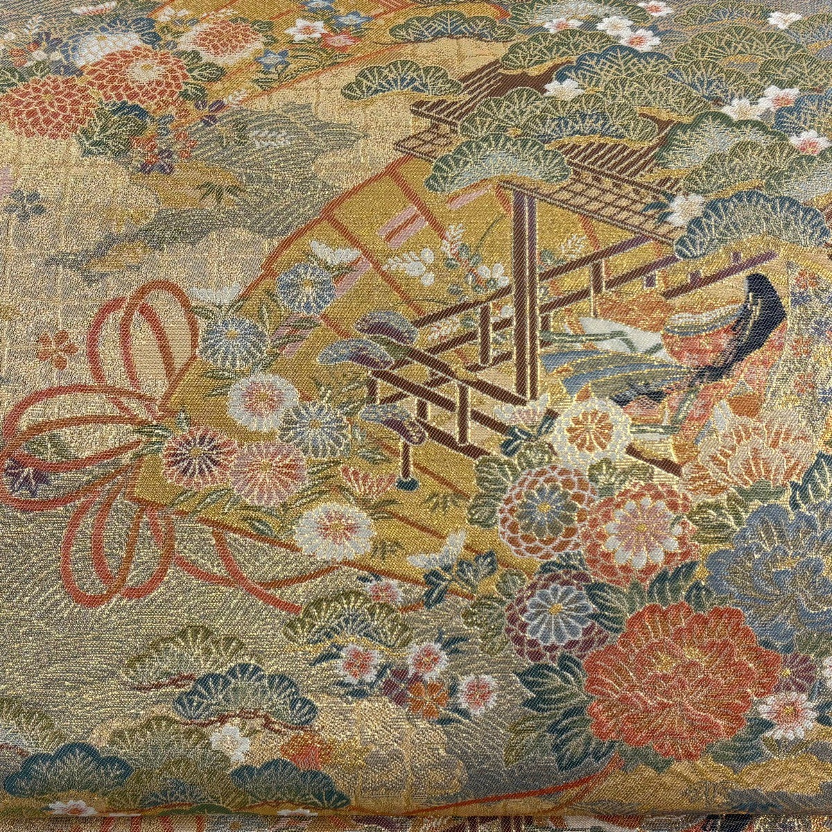 【美品】 袋帯 秀品 鳳祥絵巻 草花 桧扇 箔 金糸 金色 全通 正絹