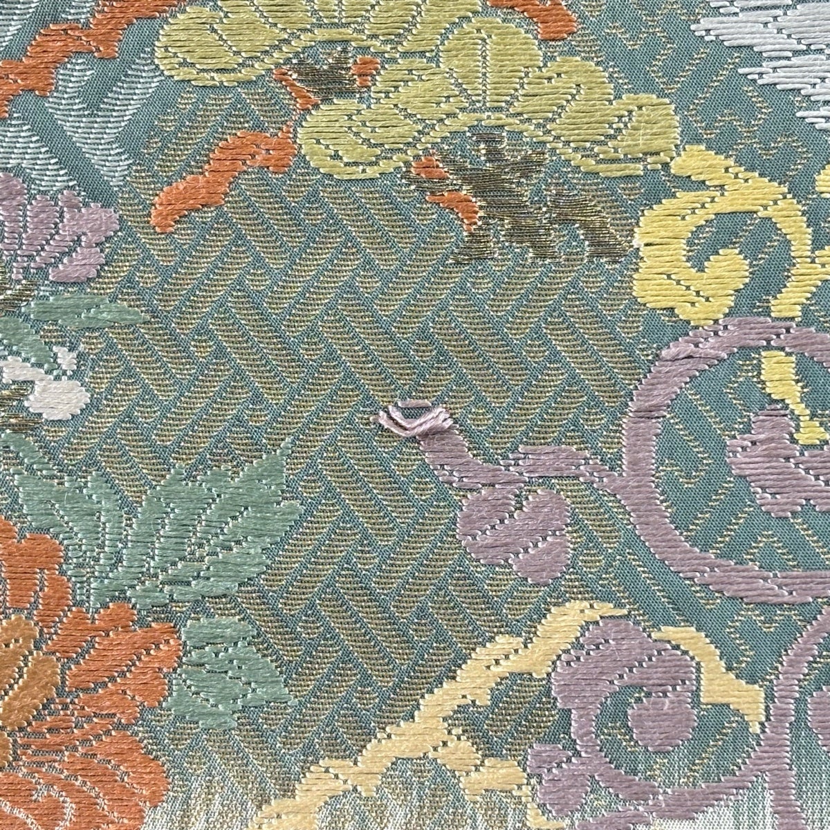 【美品】 袋帯 秀品 関西仕立て 秋草 籠目 箔 青灰色 六通 正絹