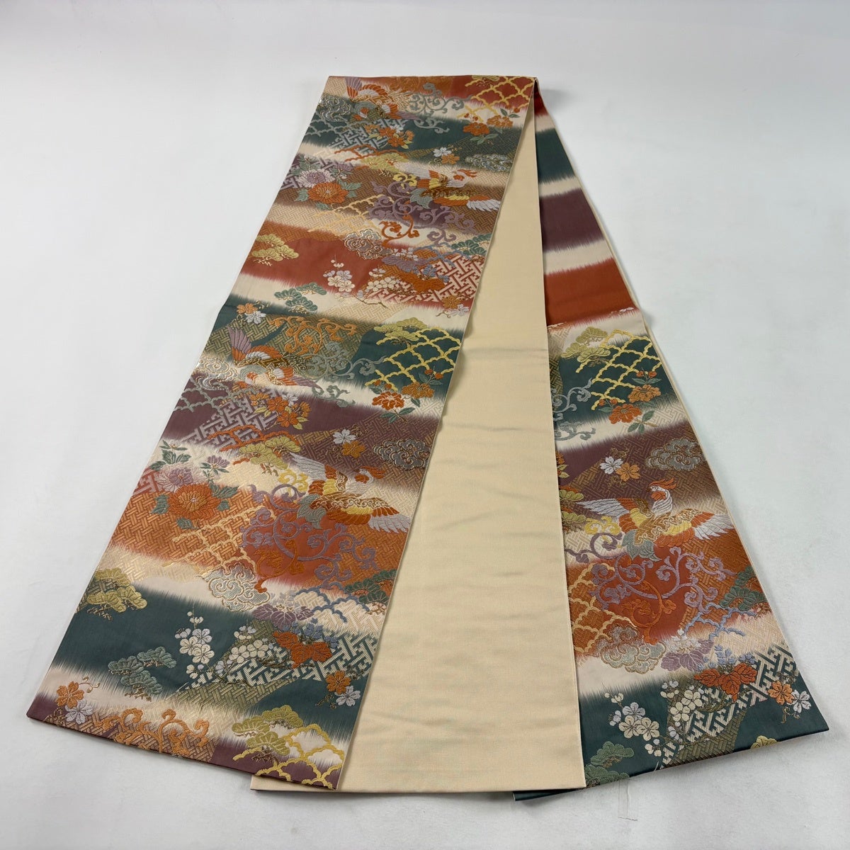 【美品】 袋帯 名品 関西仕立て 菱 鶴 箔 金糸 茶色 六通 正絹