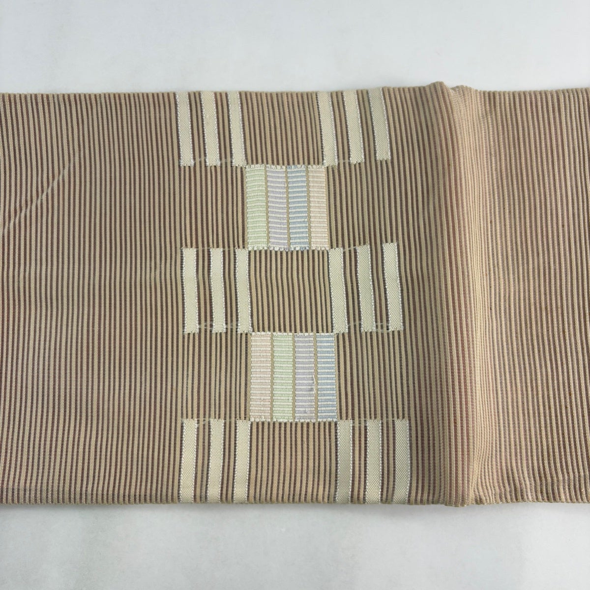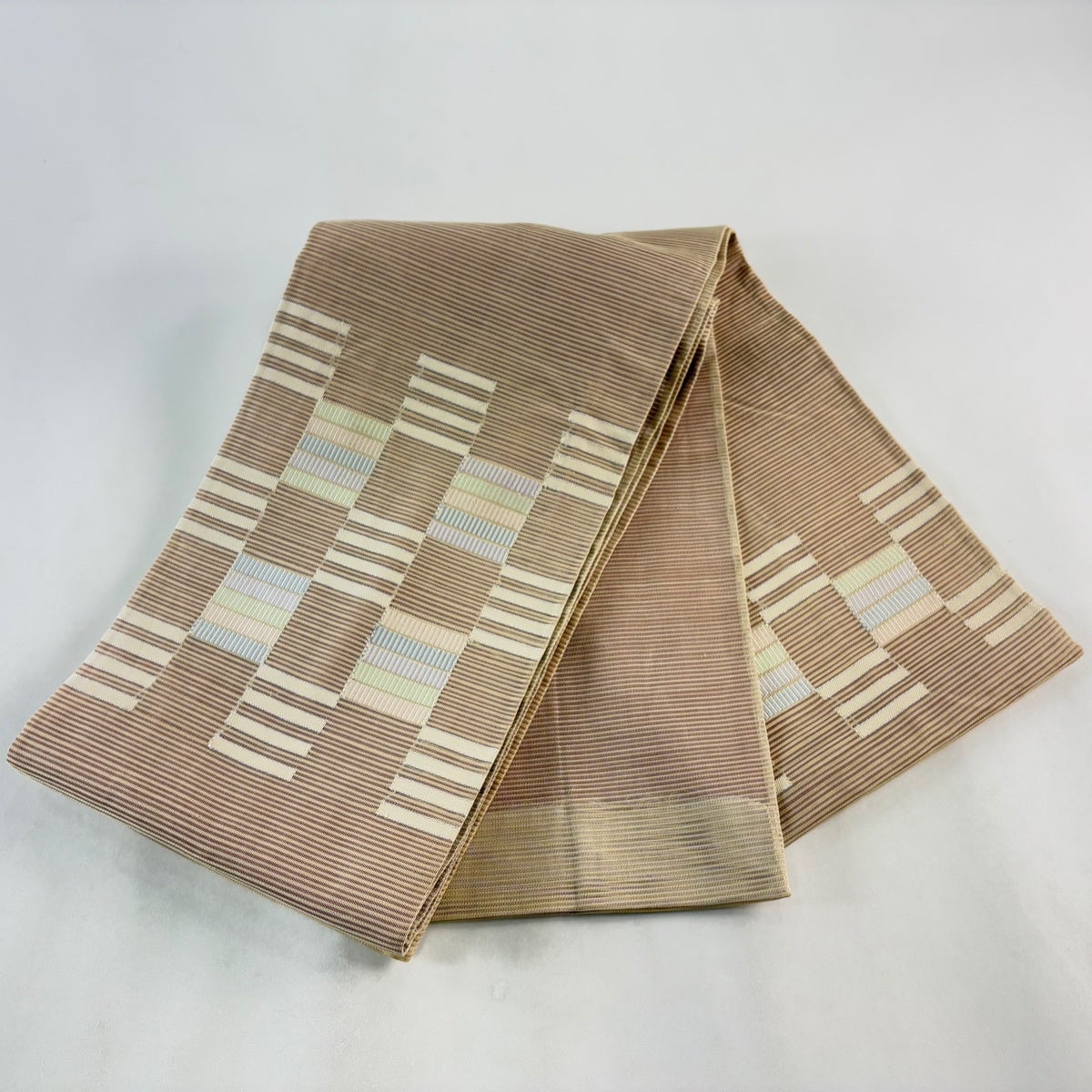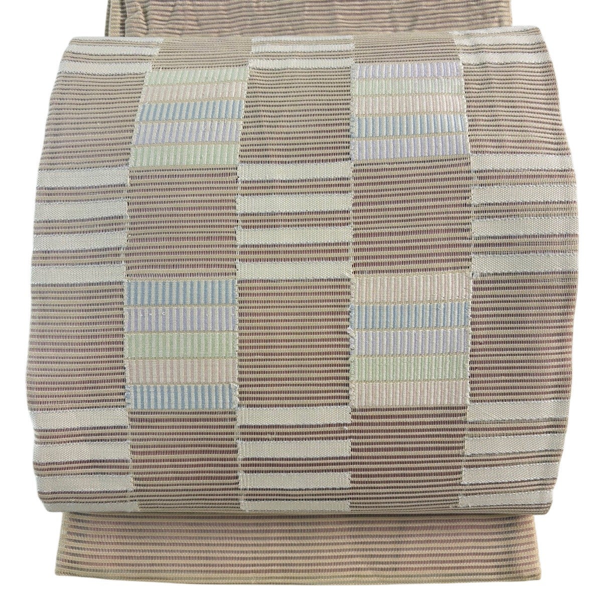 【美品】 袋帯 秀品 夏帯 幾何学 箔 ベージュ お太鼓柄 正絹
