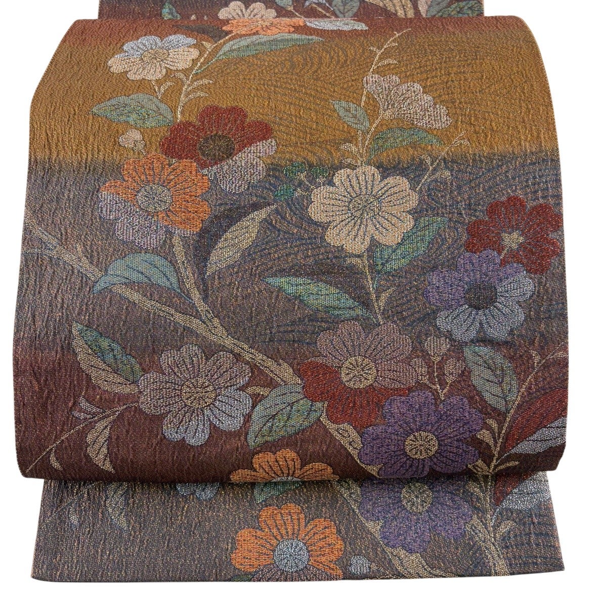 袋帯 秀品 花 流水 金銀糸 箔 金色 六通 正絹