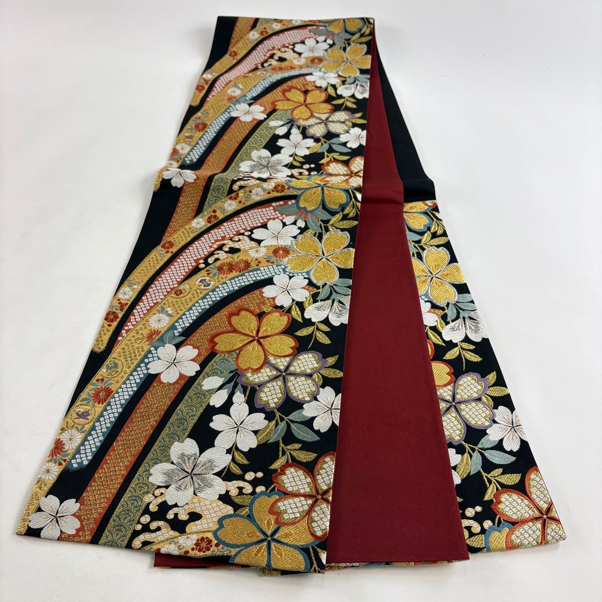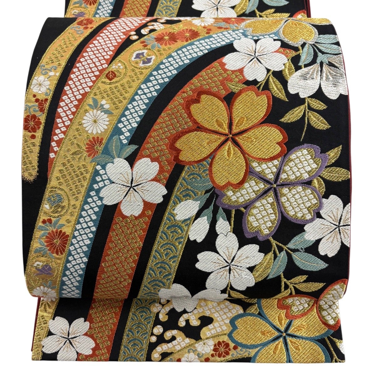 袋帯 秀品 花 波 金銀糸 唐織 黒 六通 正絹
