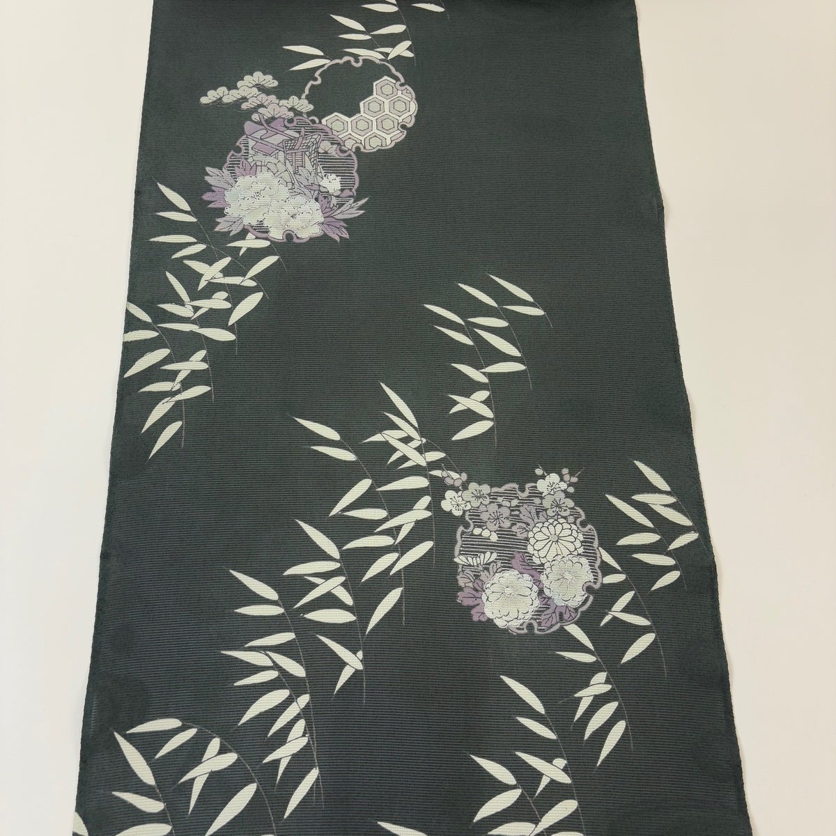 反物 秀品 付下げ 扇面 松 金糸 金銀彩 灰緑 正絹