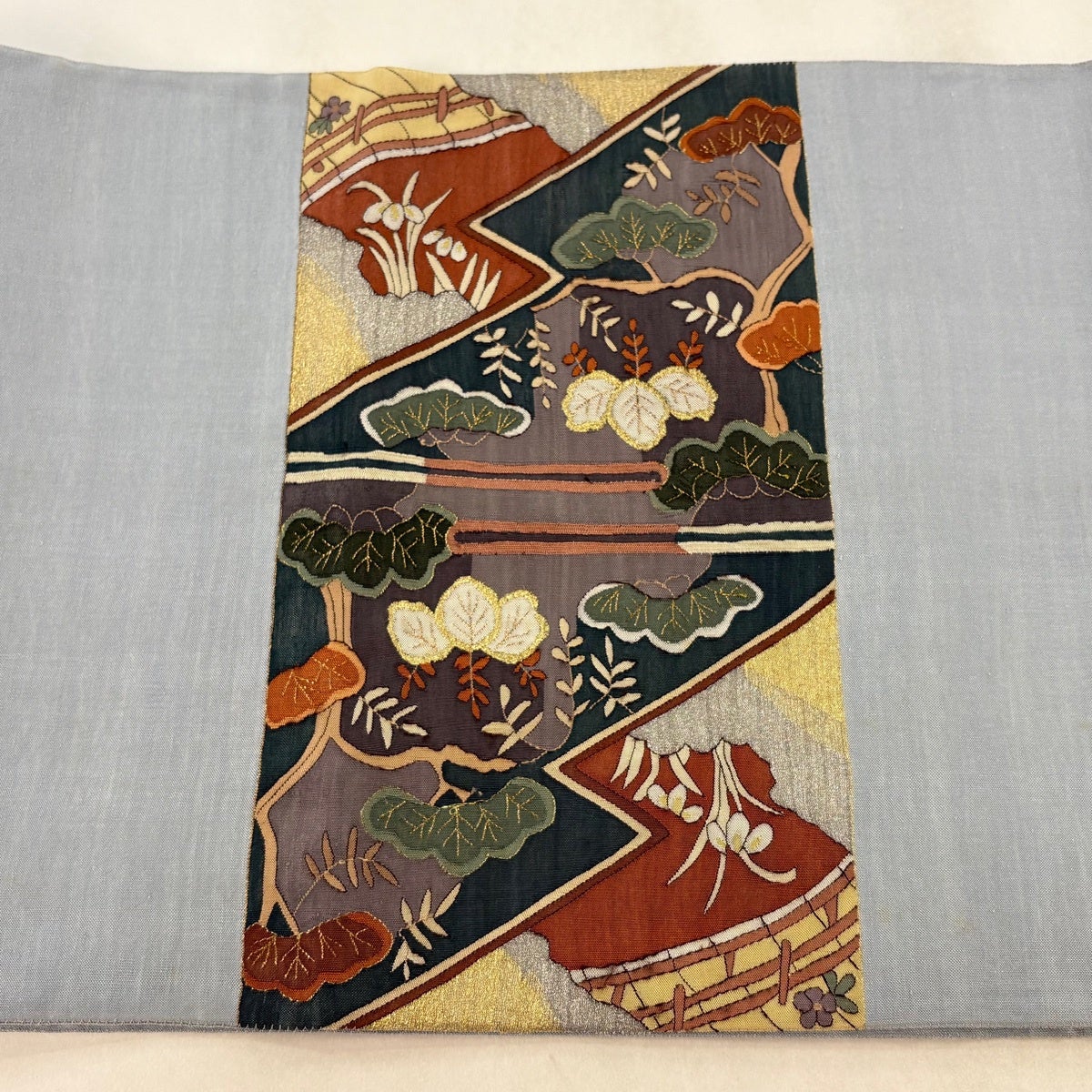 袋帯 秀品 草花 格子 金銀糸 青灰色 六通 正絹