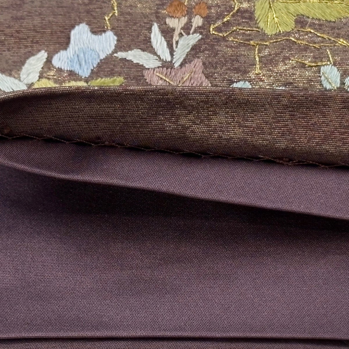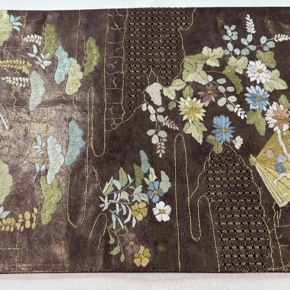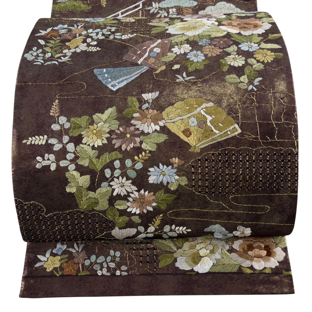 袋帯 逸品 扇 草花 刺繍 金糸 茶紫 六通 正絹