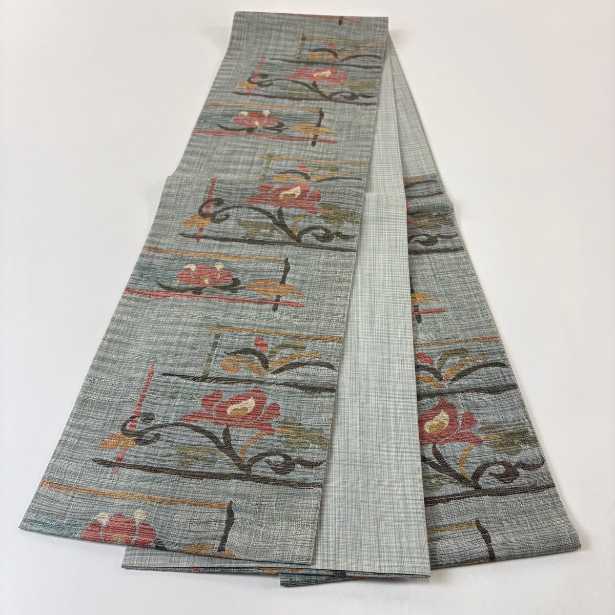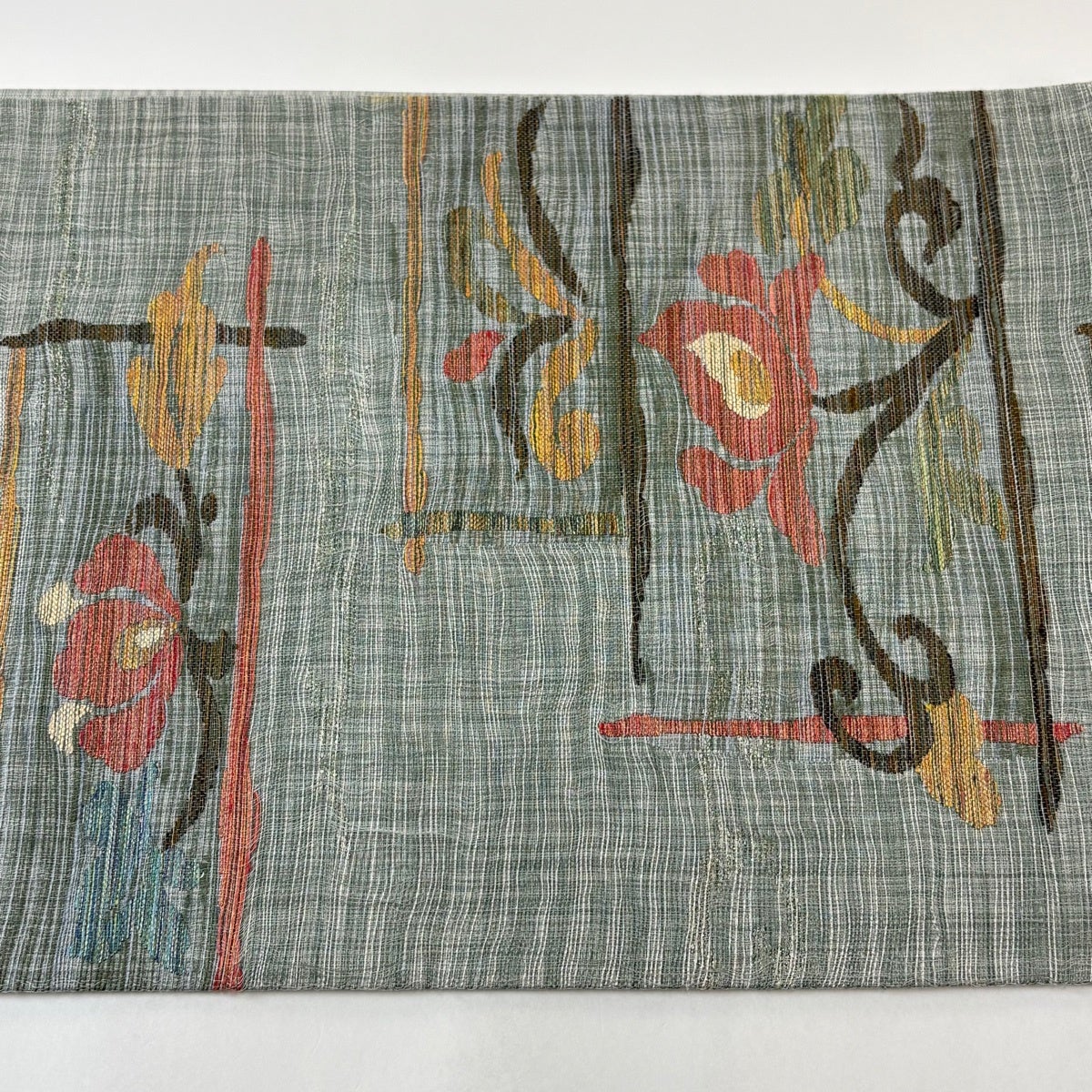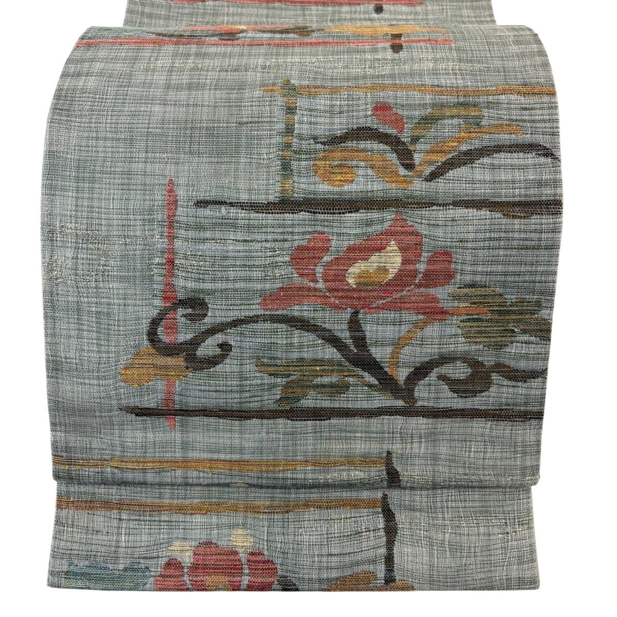 袋帯 秀品 夏帯 芝 花 金糸 青灰色 お太鼓柄 正絹