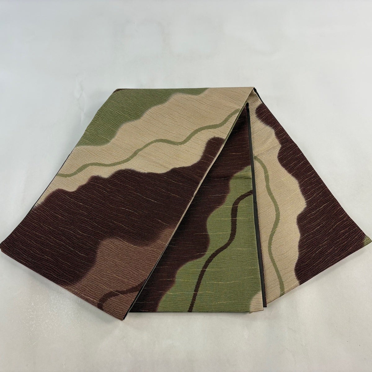 【美品】 袋帯 秀品 花 縞 金糸 茶緑色 全通 正絹