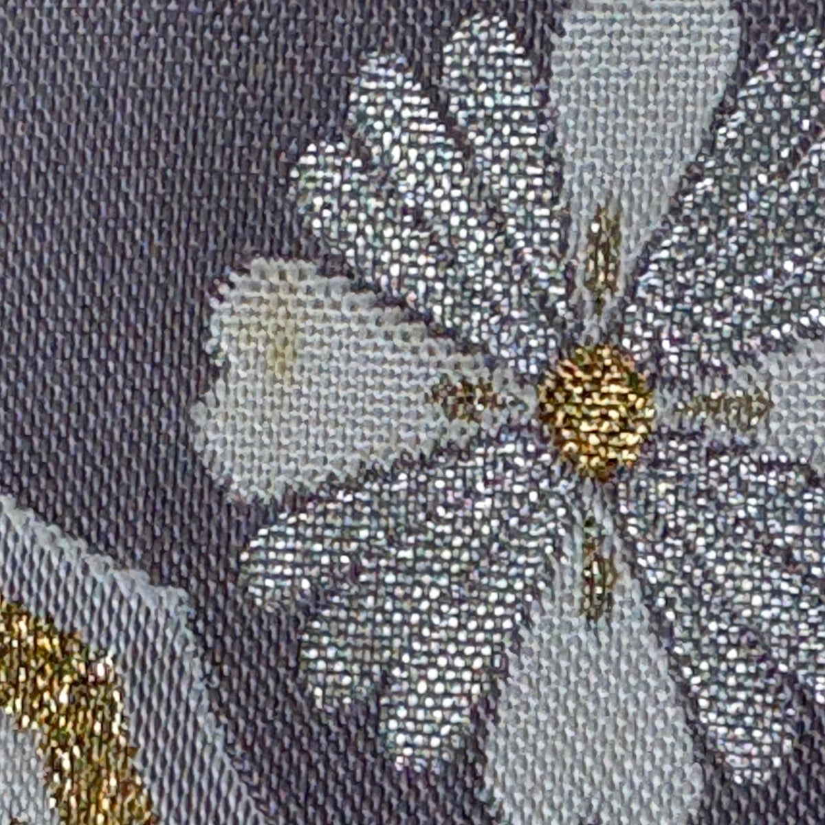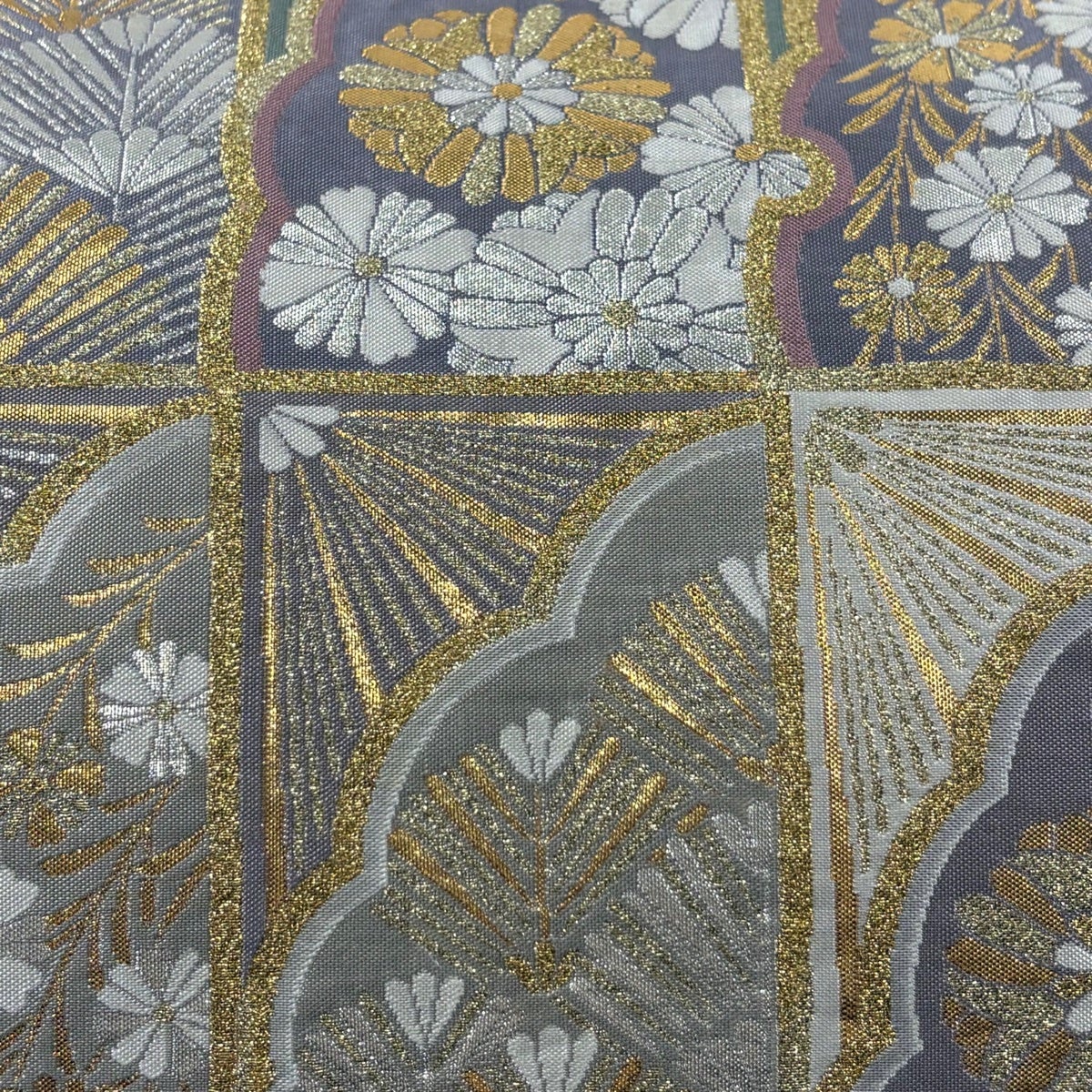 袋帯 秀品 草花 縞 箔 灰色 六通 正絹