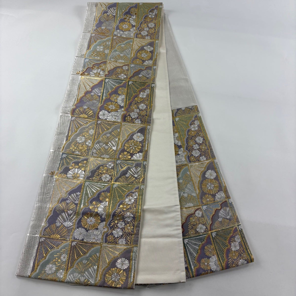 袋帯 秀品 華文 縞 箔 灰白 六通 正絹