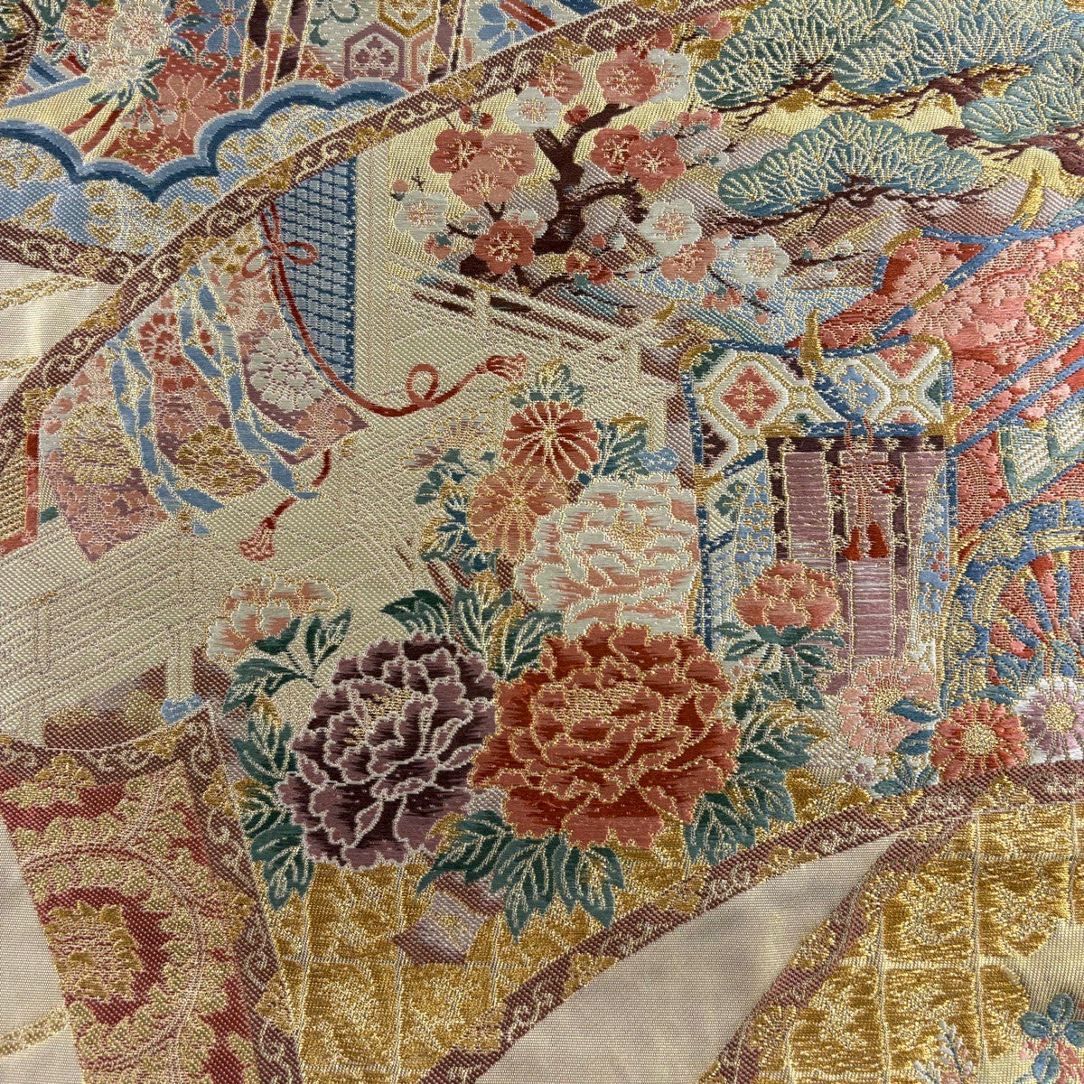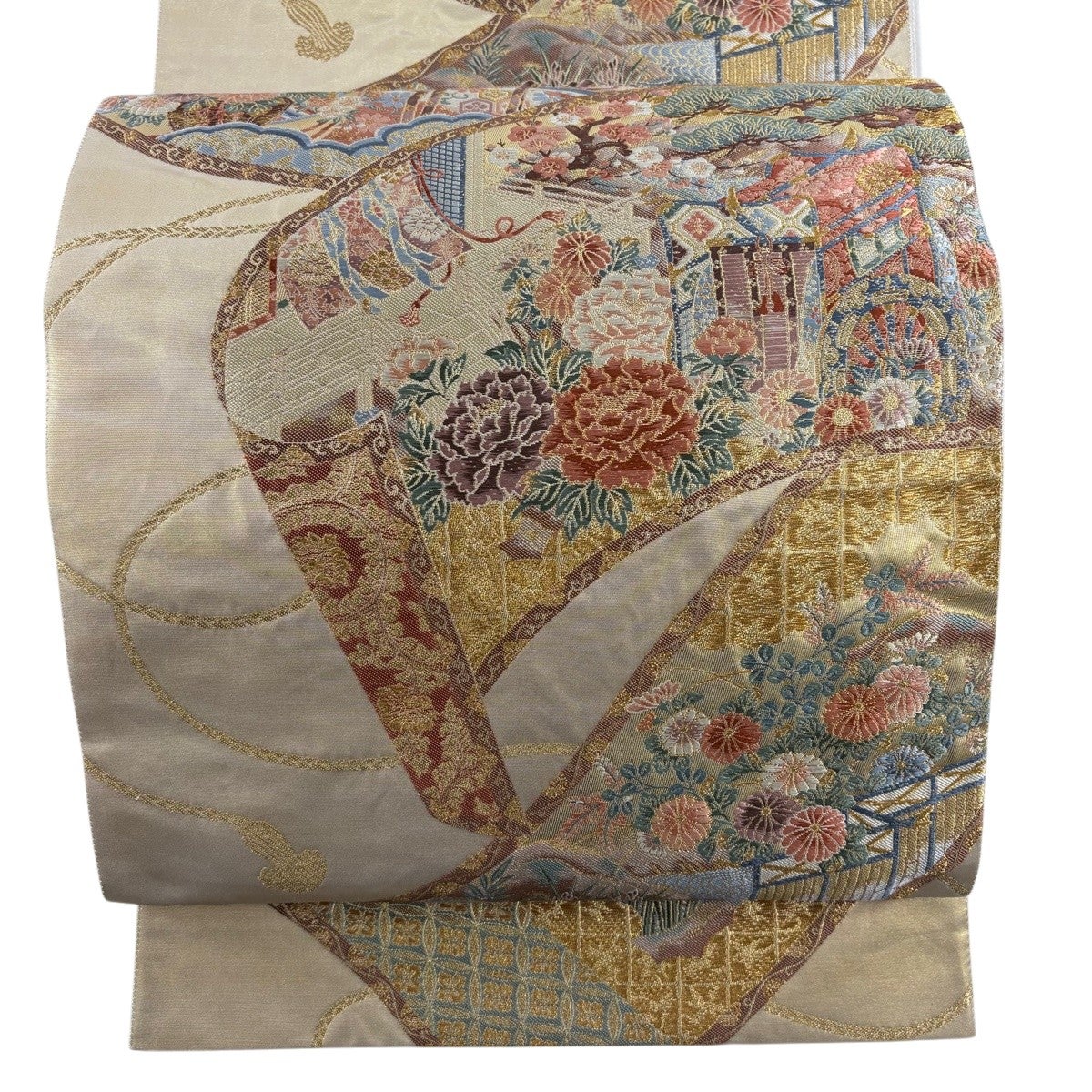 袋帯 名品 秋草 雲文 金糸 箔 クリーム 六通 正絹