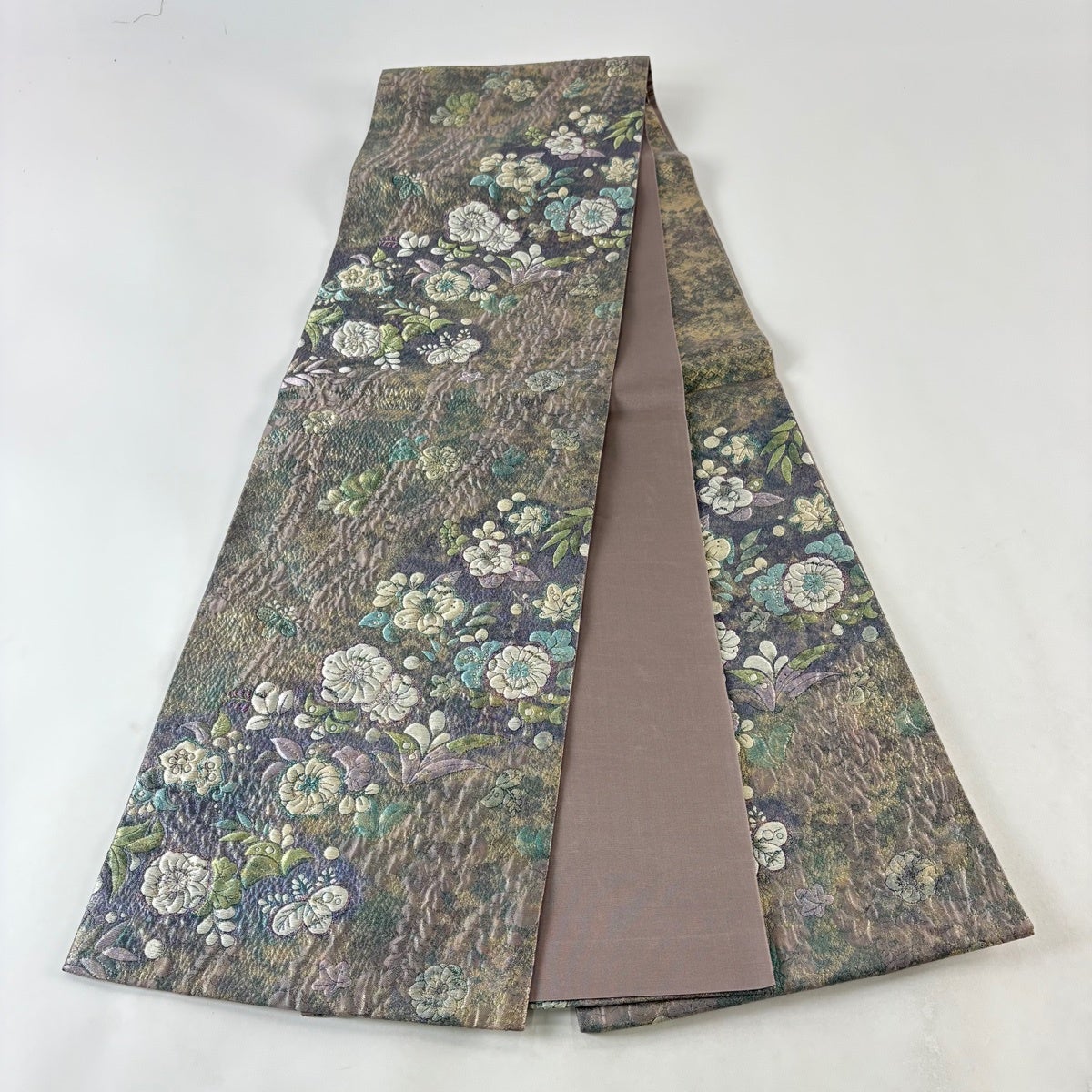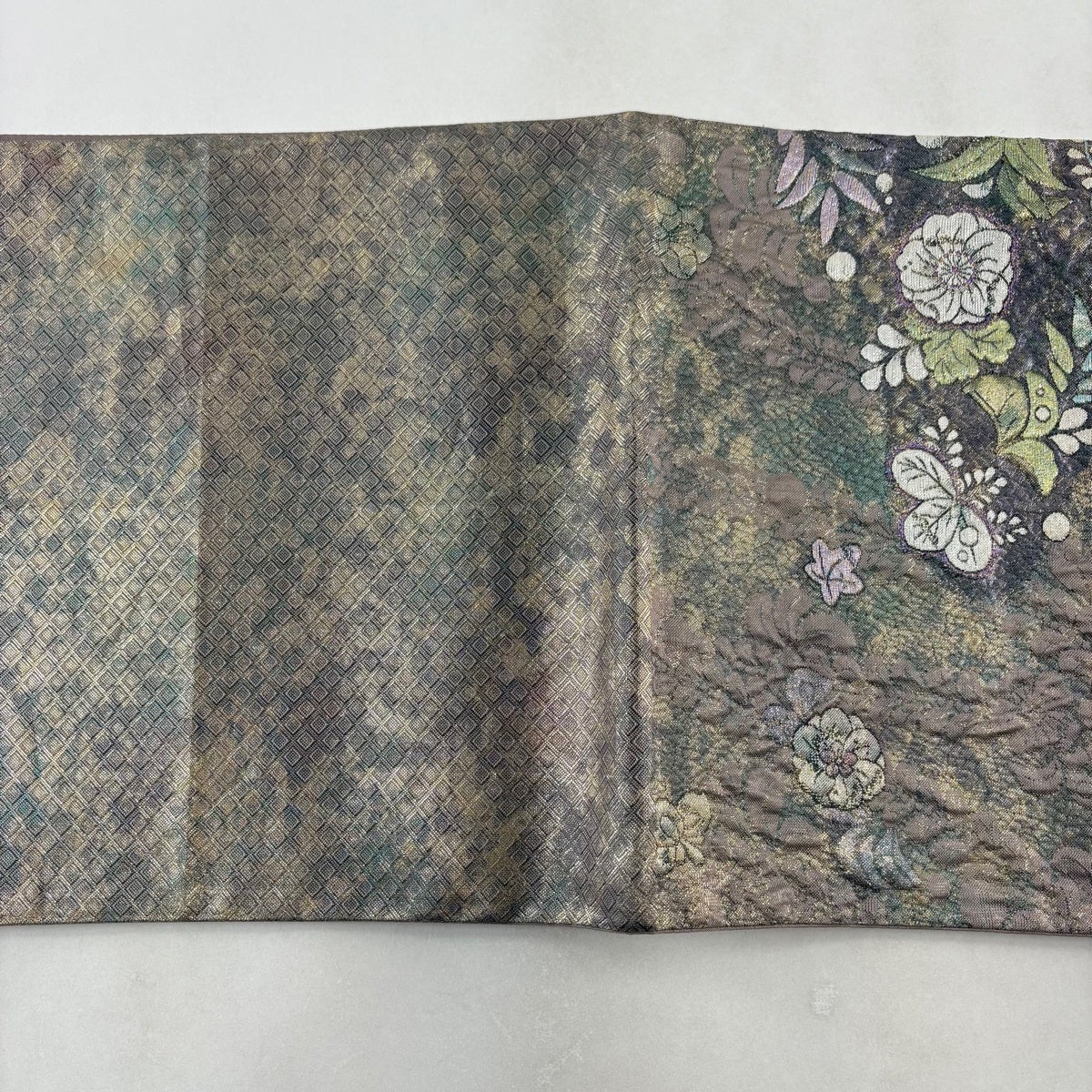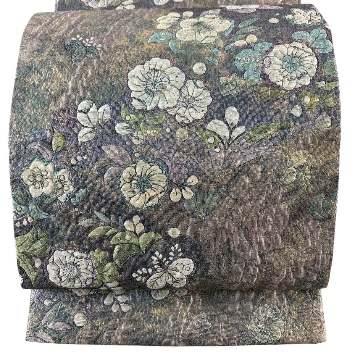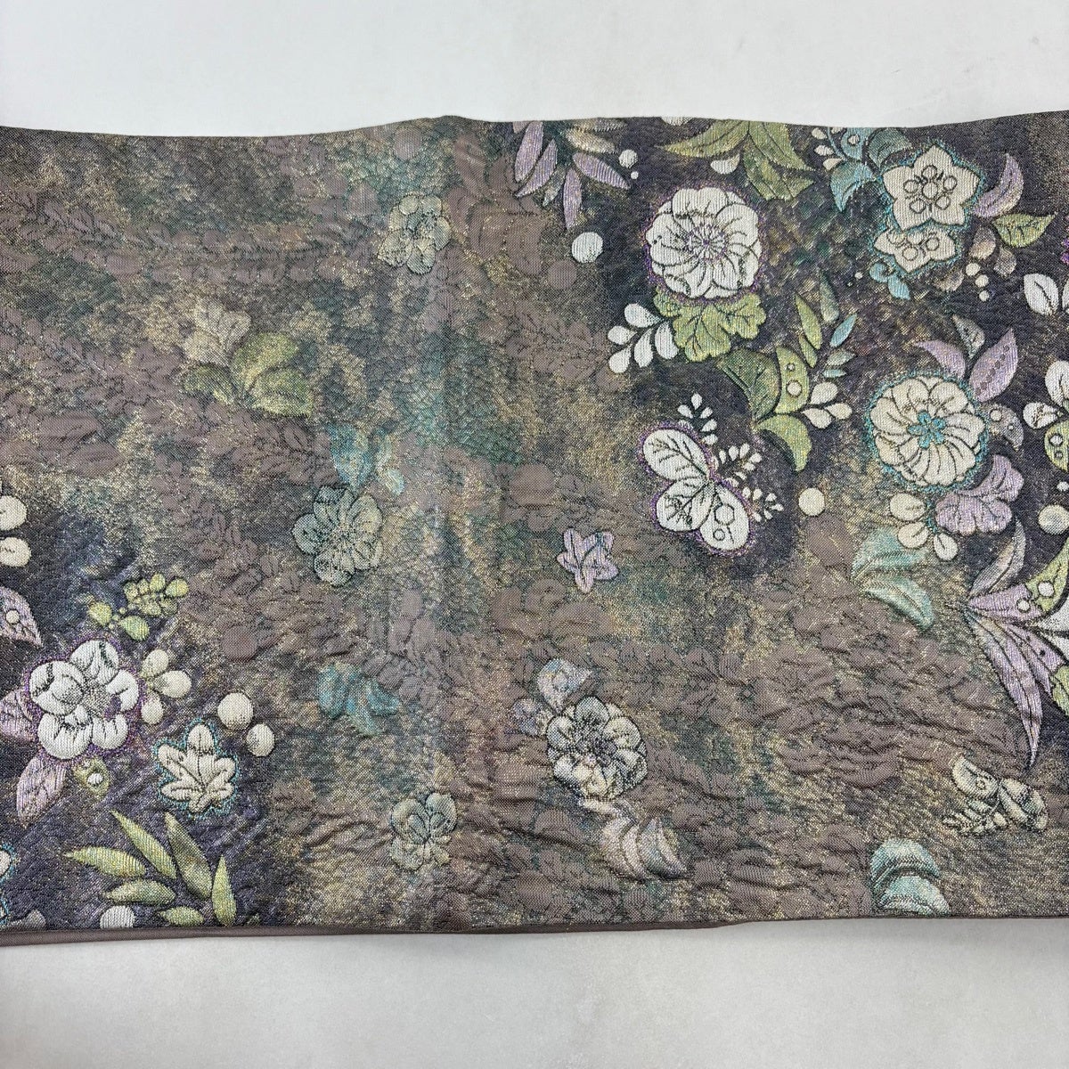 【美品】 袋帯 秀品 花丸文 草花 箔 灰色 六通 正絹