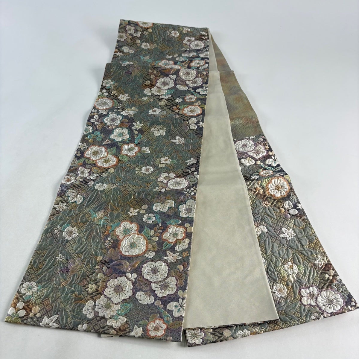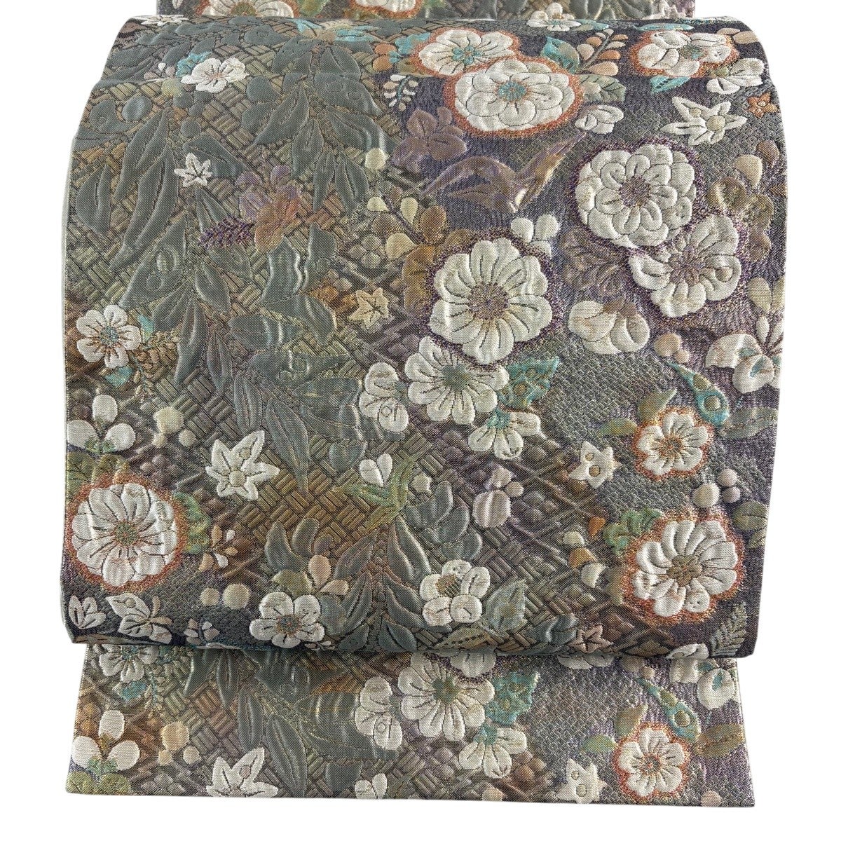 袋帯 秀品 夏帯 桔梗 萩 金銀糸 灰緑 お太鼓柄 正絹