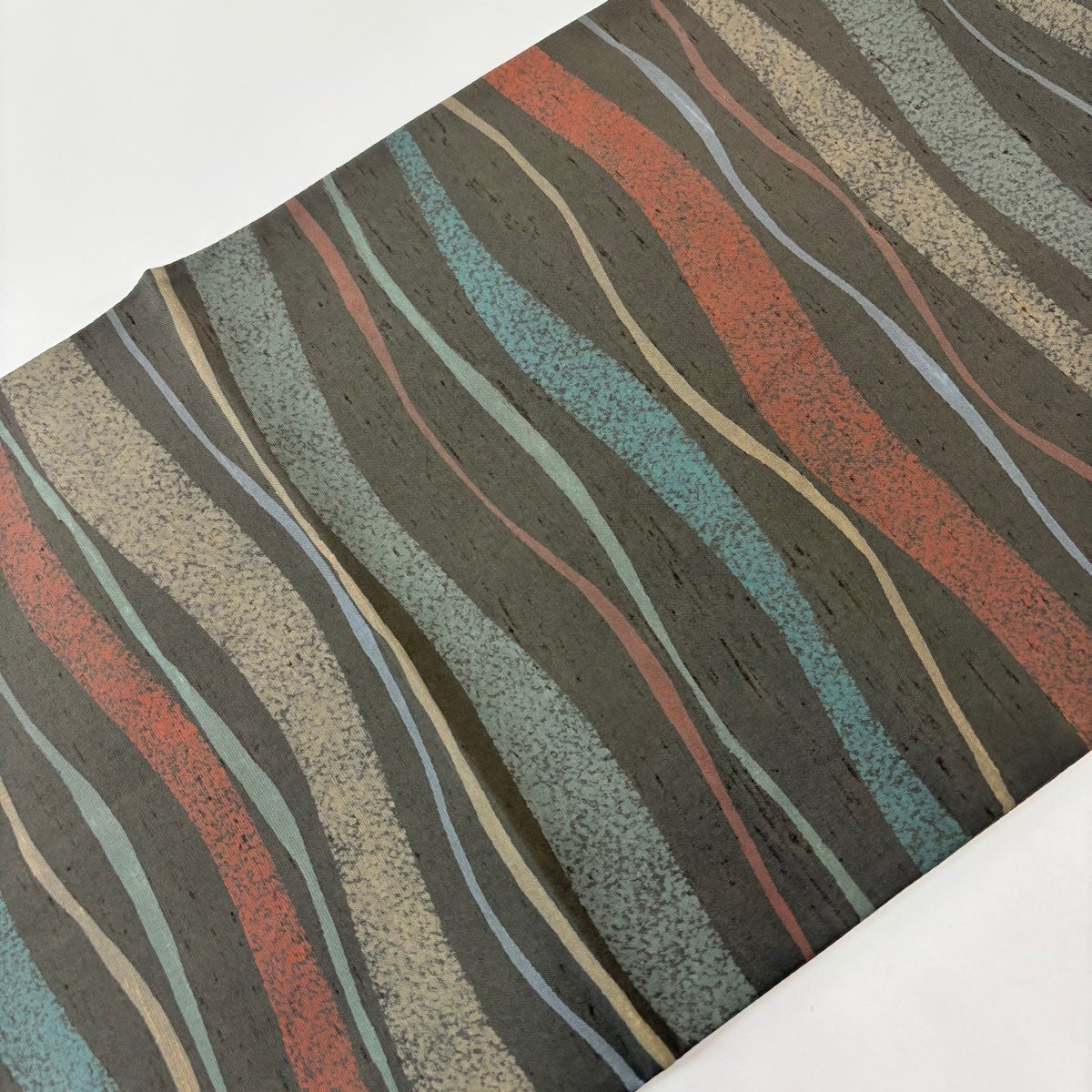 袋帯 逸品 落款あり 牛首紬地 よろけ縞 波 深緑 全通 正絹