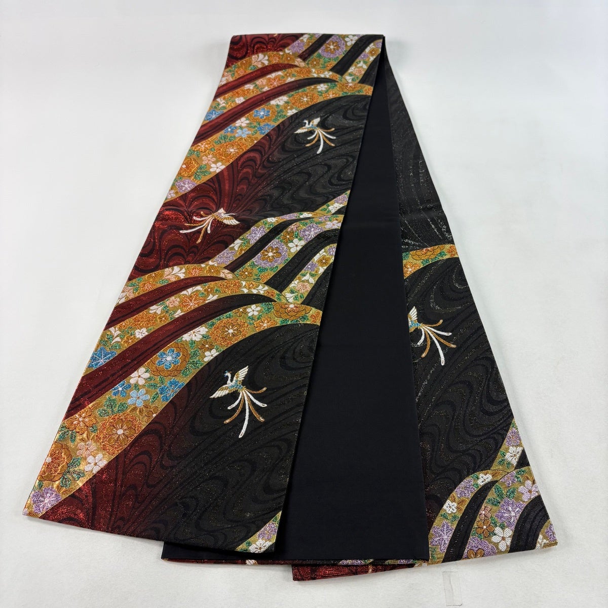 【美品】 袋帯 秀品 尾長鳥 草花 箔 金糸 赤黒 六通 正絹