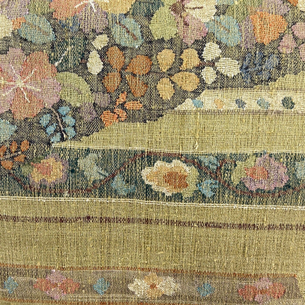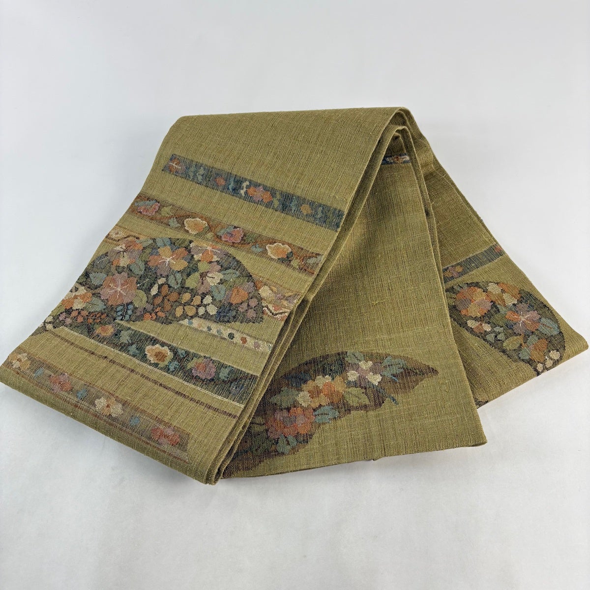 【美品】 袋帯 秀品 紬地 草花 段縞 抹茶色 お太鼓柄 正絹