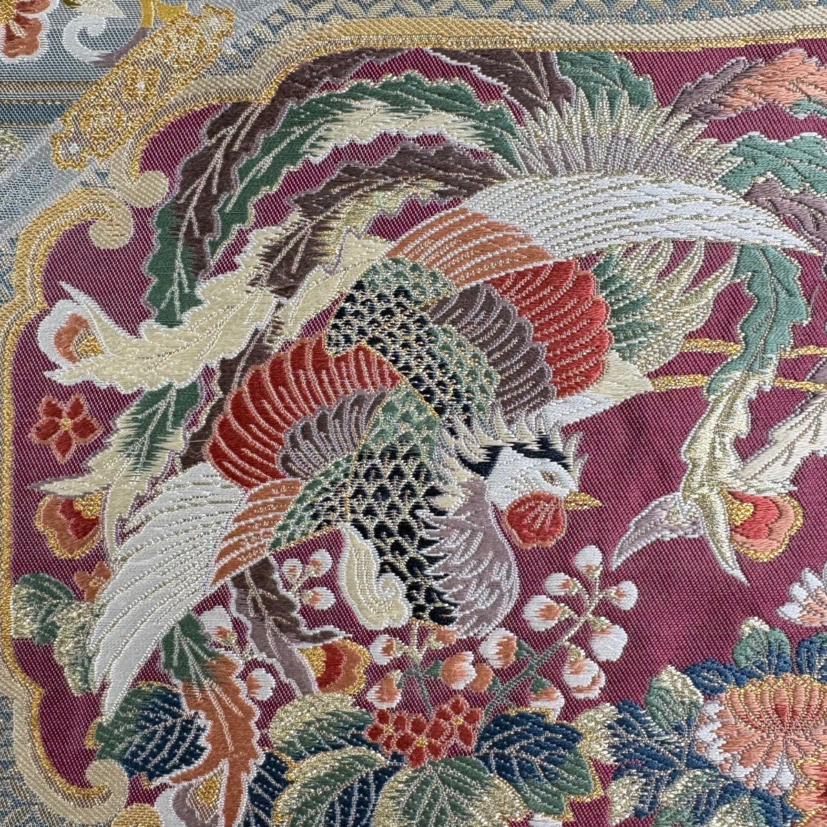 【美品】 袋帯 秀品 鳳凰 草花 箔 金糸 青灰色 六通 正絹