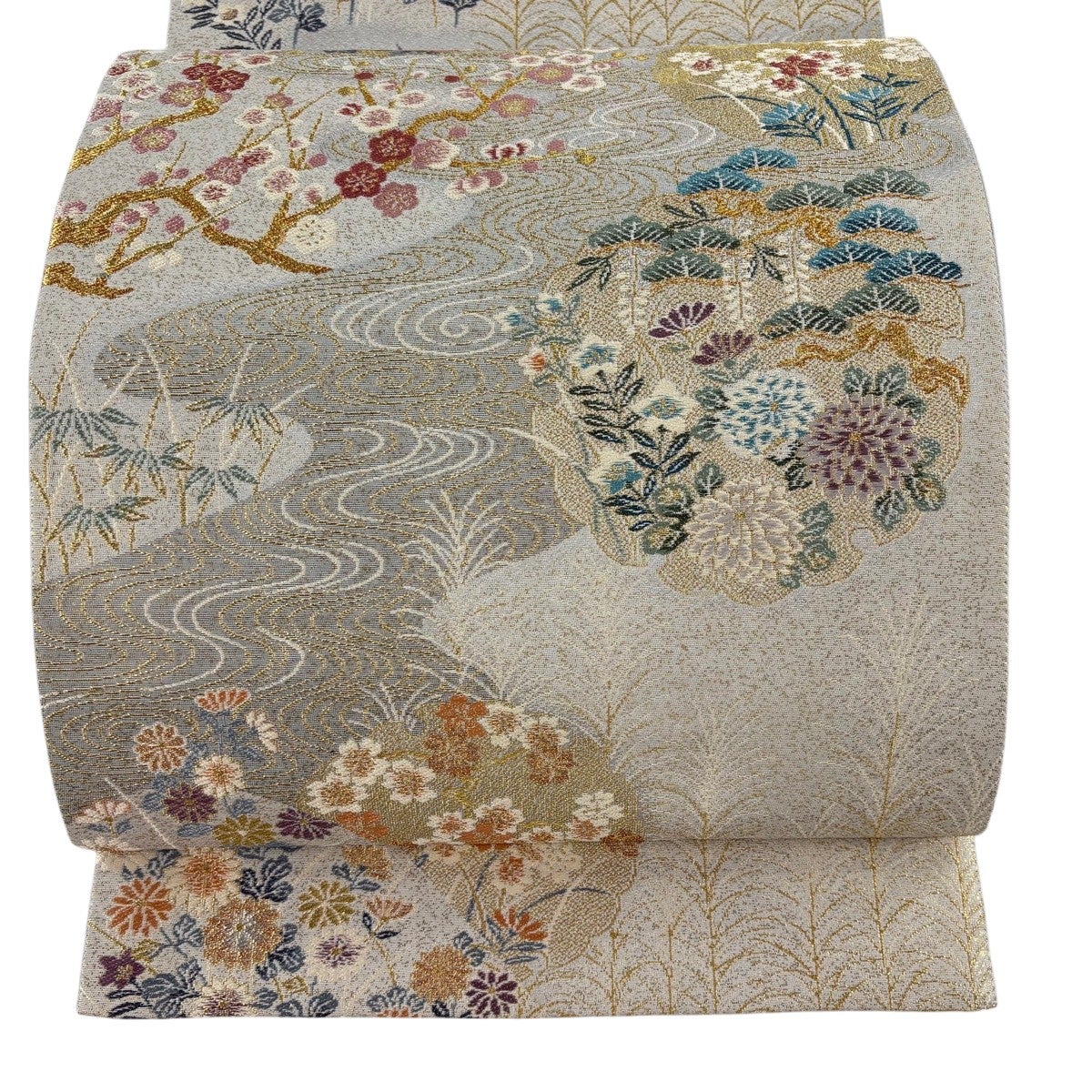 袋帯 秀品 ねじ梅 箔 金銀糸 灰白 六通 正絹