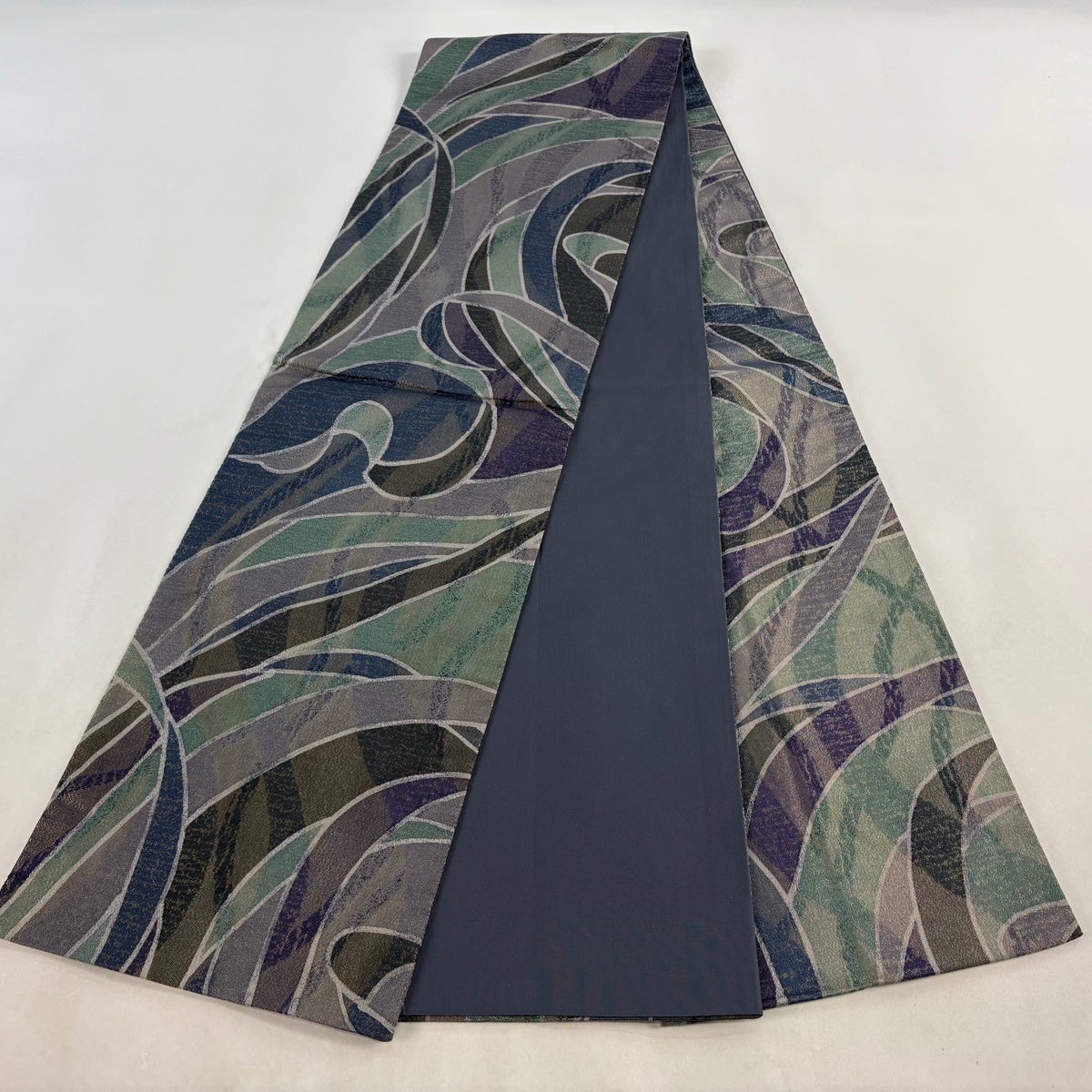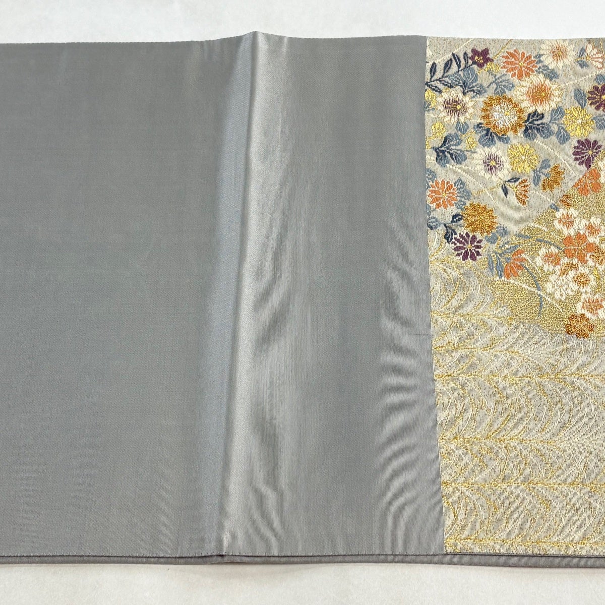 袋帯 秀品 草花 幾何学 金糸 灰緑 六通 正絹