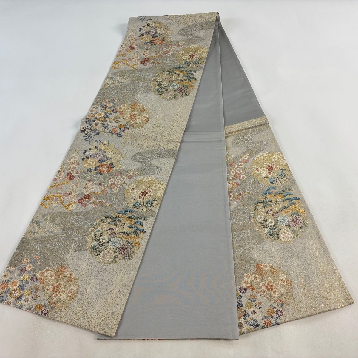 袋帯 秀品 枝花 箔 金彩 銀色 お太鼓柄 正絹