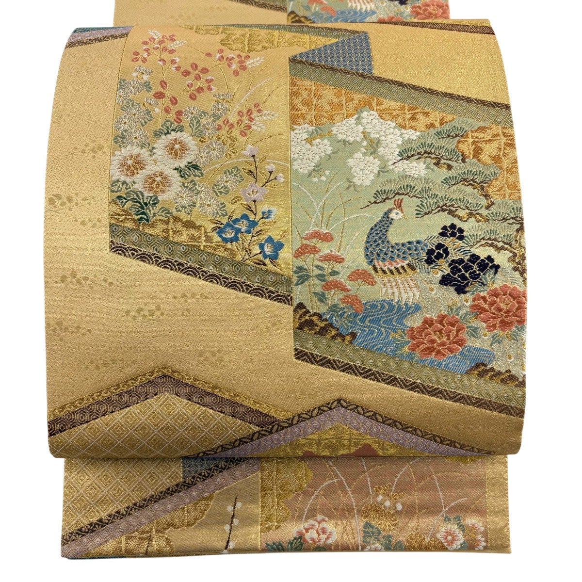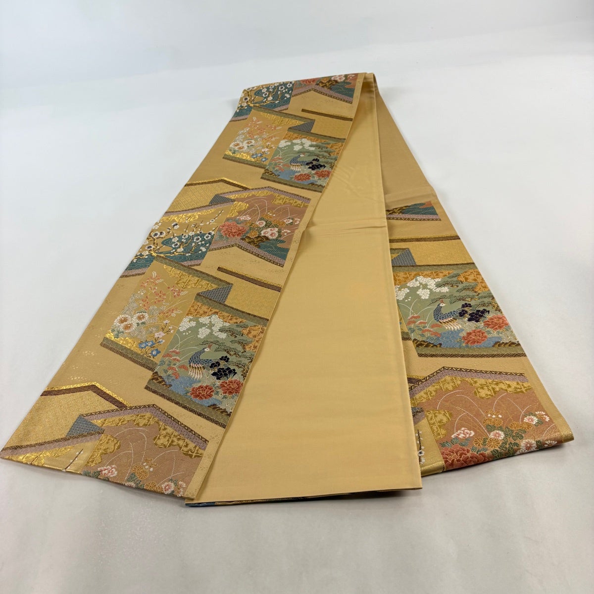 袋帯 秀品 屏貼花鳥紋 箔 金糸 金色 六通 正絹